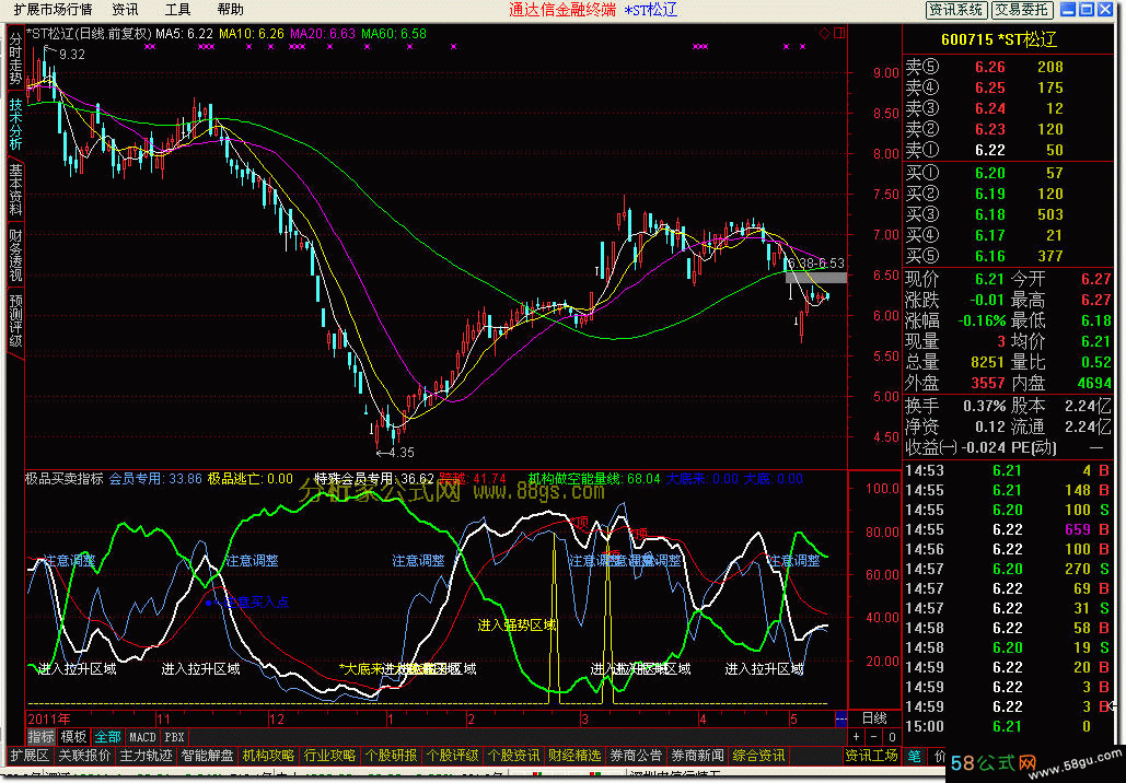 Var1:=REF(CLOSE,2); 会员专用: SMA(MAX(CLOSE-Var1,0),7,1)/SMA(ABS(CLOSE-Var1),7,1)*100,COLORFFAA66; Var2:=REF(CLOSE,1); Var3:=SMA(MAX(CLOSE-Var2,0),7,1)/SMA(ABS(CLOSE-Var2),7,1)*100; 极品逃亡: IF(会员专用< REF(会员专用,1) AND 会员专用>79,会员专用,0); DRAWTEXT(极品逃亡 ,70 ,'★<-极品逃亡'),coloryellow,linethick1; DRAWTEXT(88>0 and ref(o,1)/ref(c,1)>1.04 and ref(l,1)<=688 and o>ref(c,1)and c<ref(o,1)and c/o>=1.01,l-l*0.02,'★<--极品绝底初现'),linethick1; DRAWTEXT(c-o>=0 and o/l>1.05 and l<=llv(l,20),l,'★<--极品绝底'),colorblue, linethick1; q2:=(CLOSE-LLV(LOW, 18))/(HHV(HIGH, 18)-LLV(LOW, 18))*100; q3:=SMA(q2, 9, 1); q4:=SMA(q3, 3, 1); 特殊会员专用:3*q3-2*q4,colorwhite,linethick2; q8:=HHVBARS(HIGH, 50); q10:=(CLOSE-REF(OPEN, q8))/REF(OPEN, q8)*100; 跨越:EMA(q3, 3),COLORRED; DRAWTEXT(CROSS(特殊会员专用, 8) AND q10<-13,20,'*大底来'),coloryellow,linethick5; DRAWTEXT(CROSS(特殊会员专用, 93) AND q10<-13,40,'*大底'),linethick5; DRAWTEXT(CROSS(跨越, 特殊会员专用) AND ref(特殊会员专用,1)>80, ref(特殊会员专用,3), '*顶'),COLORRED,linethick5; Var12:=(HHV(HIGH,36)-CLOSE)/(HHV(HIGH,36)-LLV(LOW,36))*100; 机构做空能量线: SMA(Var12,3,1),colorgreen,linethick2; 大底来: 0,POINTDOT; 大底: 0,POINTDOT; DRAWTEXT(cross(跨越,机构做空能量线) ,大底+40,'进入强势区域'),coloryellow,linethick1; DRAWTEXT(cross(特殊会员专用,跨越) ,大底+20,'进入拉升区域'),linethick1; DRAWTEXT(cross(跨越,特殊会员专用) ,大底+70,'注意调整'),COLORFFAA66,linethick1; ●注意买入点: DRAWTEXT(REF(CROSS(机构做空能量线,跨越),25) AND 机构做空能量线>1.005*跨越,跨越,'●<-注意买入点'),COLORBLUE,linethick1; ★逢低买入: DRAWTEXT(REF(CROSS(跨越,特殊会员专用),82) AND 跨越>1.3*特殊会员专用,特殊会员专用,'★<<-逢低买入'),linethick1; ★低买: DRAWTEXT(REF(CROSS(特殊会员专用,跨越),1) AND 特殊会员专用>1.3*跨越,跨越,'★低买'),COLORRED,linethick1; |