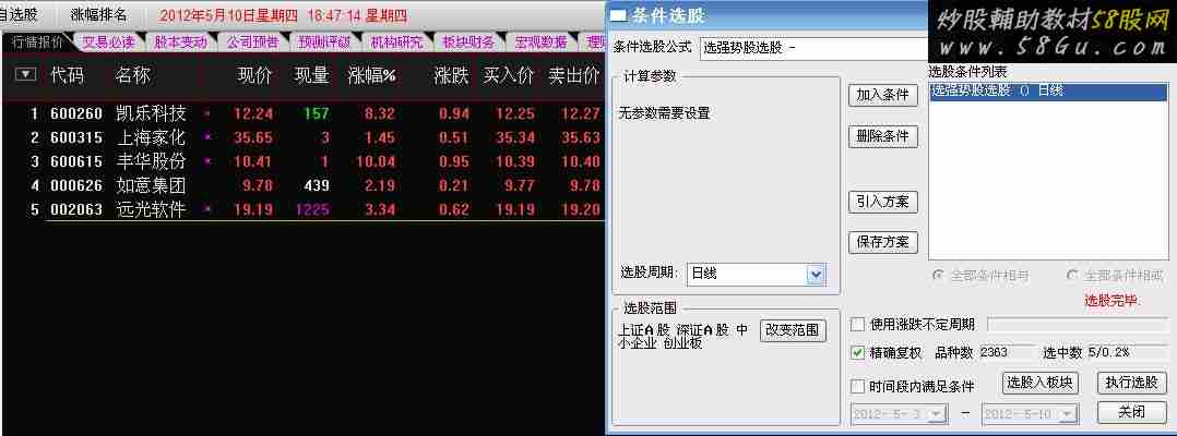 选强势股选股 【源码,选股、贴图,说明】 道学的精粹在于求今生,不在于长生不老! 你看见有几个博士以及后去做和尚、道士和尼姑的?………善哉善哉。 不往下说了,伤心、伤人、伤和气的。 说明如下: 1、这东东是俺的学习笔记,俺木知原创作者再此感谢。如论坛有该指标,劳驾辛苦版主刪除! 2、不作为买卖依据,仅供参考学习。 3、木废话啦,请望下看: 坛友先看看FINANCE、DYNAINFO 这两个未来函数,俺举例说一个,另一个你自已想。怕就木用啦! FINANCE这个函数是财务信息,为什么算未来函数? 如果在使用过程中财务数据没有及时更新,将给你带来莫大的损失.....尤其在除权前后.....很厉害哦....... (下附两大未来家族成员的名单,仅供参考!)