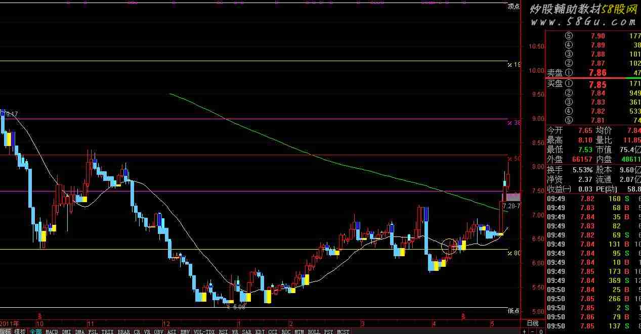 MA1:MA(CLOSE,18); MA2:MA(CLOSE,0); MA3:MA(CLOSE,0); MA4:MA(CLOSE,181); 高:=REF(HHV(H,100),100); 低:=REF(LLV(L,0),0); H19:=高-(高-低)*0.191; H38:=高-(高-低)*0.382; H中:=高-(高-低)*0.5; H61:=高-(高-低)*0.618; H80:=高-(高-低)*0.809; 顶点:REFDATE(高,DATE),COLORWHITE; %19.8:REFDATE(H19,DATE),COLORYELLOW; %38.2:REFDATE(H38,DATE),COLORMAGENTA; %50:REFDATE(H中,DATE),COLORRED; %61.8:REFDATE(H61,DATE),COLORMAGENTA; %80.9:REFDATE(H80,DATE),COLORYELLOW; 低点:REFDATE(低,DATE),COLORWHITE; DRAWTEXT(ISLASTBAR,顶点,'顶点'),COLORWHITE; DRAWTEXT(ISLASTBAR,%19.8,'%19.8'),COLORYELLOW; DRAWTEXT(ISLASTBAR,%38.2,'%38.2'),COLORMAGENTA; DRAWTEXT(ISLASTBAR,%50,'%50'),COLORRED; DRAWTEXT(ISLASTBAR,%61.8,'%61.8'),COLORMAGENTA; DRAWTEXT(ISLASTBAR,%80.9,'%80.9'),COLORYELLOW; DRAWTEXT(ISLASTBAR,低点,'低点'),COLORWHITE; VAR1:=CLOSE>REF(CLOSE,1) AND CLOSE>REF(CLOSE,2); VAR2:=REF(VAR1,1) AND CLOSE<=REF(CLOSE,1) AND CLOSE>=REF(CLOSE,2); VAR3:=REF(VAR2,1) AND CLOSE>=REF(CLOSE,1) AND CLOSE<=REF(CLOSE,2); VAR4:=REF(VAR3,1) AND CLOSE<=REF(CLOSE,1) AND CLOSE>=REF(CLOSE,2); VAR5:=REF(VAR4,1) AND CLOSE>=REF(CLOSE,1) AND CLOSE<=REF(CLOSE,2); VAR6:=REF(VAR5,1) AND CLOSE<=REF(CLOSE,1) AND CLOSE>=REF(CLOSE,2); VAR7:=REF(VAR6,1) AND CLOSE>=REF(CLOSE,1) AND CLOSE<=REF(CLOSE,2); VAR8:=REF(VAR7,1) AND CLOSE<=REF(CLOSE,1) AND CLOSE>=REF(CLOSE,2); VAR9:=REF(VAR8,1) AND CLOSE>=REF(CLOSE,1) AND CLOSE<=REF(CLOSE,2); VARA:=REF(VAR9,1) AND CLOSE<=REF(CLOSE,1) AND CLOSE>=REF(CLOSE,2); VARB:=REF(VARA,1) AND CLOSE>=REF(CLOSE,1) AND CLOSE<=REF(CLOSE,2); VARC:=REF(VARB,1) AND CLOSE<=REF(CLOSE,1) AND CLOSE>=REF(CLOSE,2); STICKLINE(VAR1 OR VAR2 OR VAR3 OR VAR4 OR VAR5 OR VAR6 OR VAR7 OR VAR8 OR VAR9 OR VARA OR VARB OR VARC,CLOSE,REF(CLOSE,1),3,1),COLORRED;{红1}; VARD:=CLOSE<REF(CLOSE,1) AND CLOSE<REF(CLOSE,2); VARE:=REF(VARD,1) AND CLOSE>=REF(CLOSE,1) AND CLOSE<=REF(CLOSE,2); VARF:=REF(VARE,1) AND CLOSE<=REF(CLOSE,1) AND CLOSE>=REF(CLOSE,2); VAR10:=REF(VARF,1) AND CLOSE>=REF(CLOSE,1) AND CLOSE<=REF(CLOSE,2); VAR11:=REF(VAR10,1) AND CLOSE<=REF(CLOSE,1) AND CLOSE>=REF(CLOSE,2); VAR12:=REF(VAR11,1) AND CLOSE>=REF(CLOSE,1) AND CLOSE<=REF(CLOSE,2); VAR13:=REF(VAR12,1) AND CLOSE<=REF(CLOSE,1) AND CLOSE>=REF(CLOSE,2); VAR14:=REF(VAR13,1) AND CLOSE>=REF(CLOSE,1) AND CLOSE<=REF(CLOSE,2); VAR15:=REF(VAR14,1) AND CLOSE<=REF(CLOSE,1) AND CLOSE>=REF(CLOSE,2); VAR16:=REF(VAR15,1) AND CLOSE>=REF(CLOSE,1) AND CLOSE<=REF(CLOSE,2); VAR17:=REF(VAR16,1) AND CLOSE<=REF(CLOSE,1) AND CLOSE>=REF(CLOSE,2); VAR18:=REF(VAR17,1) AND CLOSE>=REF(CLOSE,1) AND CLOSE<=REF(CLOSE,2); STICKLINE(VARD OR VARE OR VARF OR VAR10 OR VAR11 OR VAR12 OR VAR13 OR VAR14 OR VAR15 OR VAR16 OR VAR17 OR VAR18,CLOSE,REF(CLOSE,1),3,0),COLORFFCC66; VAR19:=REF(VARD OR VARE OR VARF OR VAR10 OR VAR11 OR VAR12 OR VAR13 OR VAR14 OR VAR15 OR VAR16 OR VAR17 OR VAR18,1) AND VAR1; STICKLINE(VAR19,REF(CLOSE,1),REF(CLOSE,2),4,1),COLORYELLOW; VAR1A:=REF(VAR1 OR VAR2 OR VAR3 OR VAR4 OR VAR5 OR VAR6 OR VAR7 OR VAR8 OR VAR9 OR VARA OR VARB OR VARC,1) AND VARD;STICKLINE(VAR1A,REF(CLOSE,1),REF(CLOSE,2),5,2),COLOR00FF00{98FD}; STICKLINE(VAR19,REF(CLOSE,1),REF(CLOSE,2),3,0),COLOR00C8FF; STICKLINE(VAR19,REF(CLOSE,1),REF(CLOSE,2),2,0),COLOR10ECFF; STICKLINE(VAR19,REF(CLOSE,1),REF(CLOSE,2),2,0),COLOR10FFFF; STICKLINE(VAR1A,REF(CLOSE,1),REF(CLOSE,2),3,0),COLOR00D900; STICKLINE(VAR1A,REF(CLOSE,1),REF(CLOSE,2),3,0),COLORBLUE; STICKLINE(VAR1A,REF(CLOSE,1),REF(CLOSE,2),0,0),COLOR090FF2;