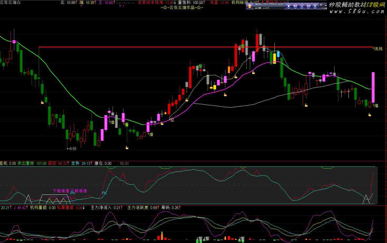 操作说明;简洁易掌握的短线走势参考图分享给童鞋们,买卖点已给出,红线出向上可考虑买进,红线低头或者向下消失考虑卖出, 参数已给,不要忘记填上 N=0, 3 ,0STICKLINE(1,100,0,10,0),COLOR222222; N:=3; VAR01:=MA(HHV(HIGH,485),17); VAR02:=MA(HHV(HIGH,222),17); VAR03:=MA(HHV(HIGH,96),17); VAR04:=MA(LLV(LOW,485),17); VAR05:=MA(LLV(LOW,222),17); VAR06:=MA(LLV(LOW,96),17); VAR07:=MA((VAR04*0.96+VAR05*0.96+VAR06*0.96+VAR01*0.558+VAR02*0.558+VAR03*0.558)/6,17); VAR08:=MA((VAR04*1.25+VAR05*1.23+VAR06*1.2+VAR01*0.55+VAR02*0.55+VAR03*0.65)/6,17); VAR09:=MA((VAR04*1.3+VAR05*1.3+VAR06*1.3+VAR01*0.68+VAR02*0.68+VAR03*0.68)/6,17); VAR10:=MA((VAR07*3+VAR08*2+VAR09)/6*1.738,17); VAR11:=IF(DATE<=1050531,VAR10,VAR10*DAY); VAR12:=LOW; VAR13:=REF(LOW,1); VAR14:=SMA(ABS(VAR12-VAR13),3,1)/SMA(MAX(VAR12-VAR13,0),N,1)*100; VAR15:=MA(IF(CLOSE*1.35<=VAR11,VAR14*10,VAR14/10),N); VAR16:=LLV(LOW,30); VAR17:=HHV(VAR15,30); VAR18:=1990831; VAR19:=IF(DATE<=VAR18,MA(IF(LOW<=VAR16,(VAR15+VAR17*2)/2,0),N),100000000); VAR20:=(HHV(H,9.8)-C)/(HHV(H,9.8)-LLV(L,9.8))*100; VAR21:=SMA(VAR20,3,1); VAR22:=SMA(VAR21,3,1); VAR23:=3*VAR21-2*VAR22; VAR24:=IF(VAR23>=100,100,IF(VAR23<=0,0,VAR23)); VAR25:=(CLOSE-MA(CLOSE,60))/MA(CLOSE,60)*100; VAR26:=100+(-ABS(VAR25)); VAR27:=(CLOSE-LLV(LOW,21))/(HHV(HIGH,21)-LLV(LOW,21))*100; VAR28:=SMA(SMA(VAR27,9,4),9,4)/7.77777; VAR29:=EMA(VAR28,5); VAR30:=3*VAR28-2*VAR29; VAR31:=CROSS(VAR30,VAR28) AND VAR28<2.7 AND C>O; VAR32:=(CLOSE-LLV(LOW,17))/(HHV(HIGH,17)-LLV(LOW,17))*100; VAR33:=(CLOSE-LLV(LOW,50))/(HHV(HIGH,50)-LLV(LOW,50))*100; VAR34:=SMA(SMA(VAR32,3,1),3,1)+3*STD(CLOSE,10); VAR35:=SMA(VAR33,3,1); VAR36:=100-((100*((HHV(HIGH,17))-CLOSE))/((HHV(HIGH,17))-(LLV(LOW,17)))); VAR37:=100-(MA(((100*((HHV(HIGH,17))-CLOSE))/((HHV(HIGH,17))-(LLV(LOW,17)))),4)); VAR38:=MA(VAR37,1); VAR39:=3*SMA((CLOSE-LLV(LOW,27))/(HHV(HIGH,27)-LLV(LOW,27))*100,5,1)-2*SMA(SMA ((CLOSE-LLV(LOW,27))/(HHV(HIGH,27)-LLV(LOW,27))*100,5,1),3,1); 底部:IF(VAR19>10000 AND VAR19>20000,2,0)*9,COLORMAGENTA; 超低:IF(VAR19>30000 AND VAR19>30000,3,0)*5,COLORYELLOW; 卖出警报:IF((VAR24=0),95,101),COLORGREEN; 超短:IF((VAR36<VAR38),VAR38,VAR36),COLORRED; 走势:(VAR38),COLORCYAN; 建仓:IF(VAR39<5,25,0),COLORWHITE; DRAWTEXT(CROSS(VAR34,VAR35) AND VAR35<18 AND VAR35>REF(VAR35,1)OR CROSS(VAR35,5),40,'千载难逢'),COLORMAGENTA; DRAWTEXT(VAR31,35,'PK'),COLORCYAN;