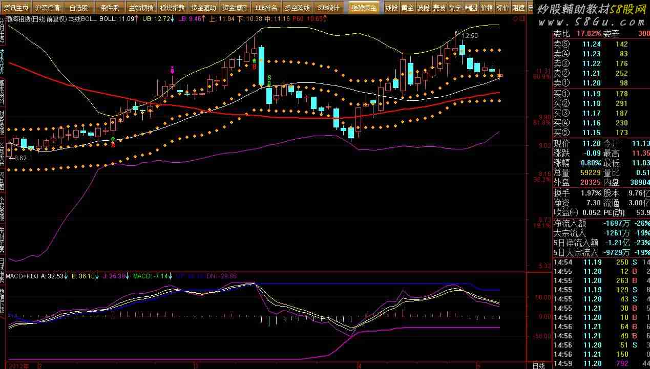 N:=20; MID:=MA(C,N); VAR1:=POW((C-MID),2); VAR2:=MA(VAR1,N); VAR3:=SQRT(VAR2); UPPER:=MID+2*VAR3; LOWER:=MID-2*VAR3; BOLL:REF(MID,1); UB:REF(UPPER,1); LB:REF(LOWER,1); AA:=MA((2*CLOSE+HIGH+LOW)/4,5); 通1:=AA*102/100; 通2:=AA*(200-102)/100; CC:=ABS((2*CLOSE+HIGH+LOW)/4-MA(CLOSE,20))/MA(CLOSE,20); DD:=DMA(CLOSE,CC); 上:(1+7/100)*DD,CIRCLEDOT,COLOR0099FF; 下:(1-7/100)*DD,CIRCLEDOT,COLOR0099FF; 中:(上+下)/2,CIRCLEDOT,COLOR0099FF;P60:MA(CLOSE,60),COLORRED,LINETHICK2; |