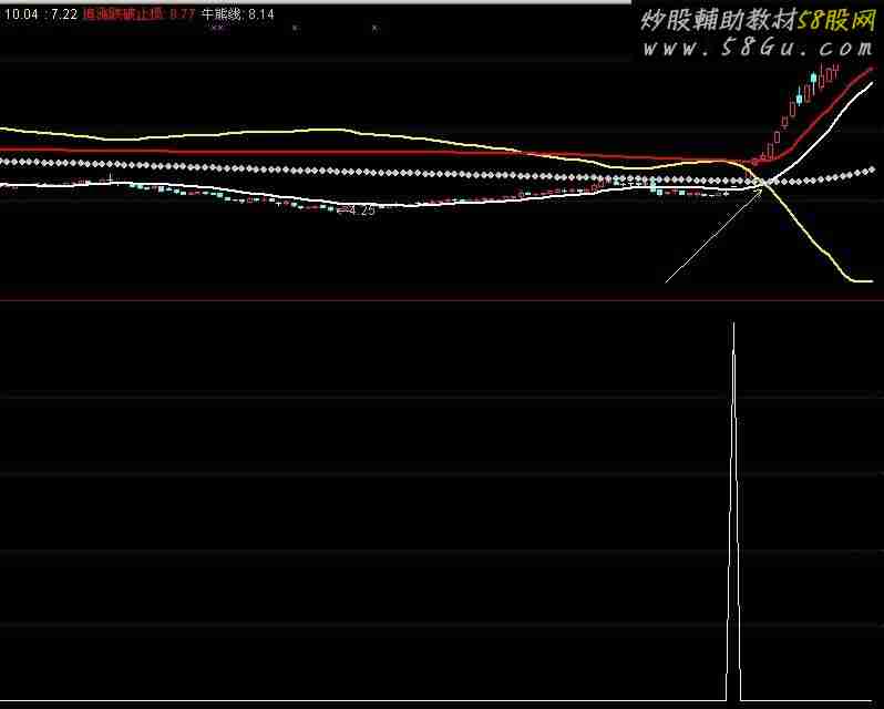 三,中间的白线在明显下跌中触碰到K线,如果黄线明显向下运动,白线向上,此时基本可进,黄基本会穿白,如果碰巧 三点形成一个点,此时百分之99形成大牛,不进你就后悔去吧
