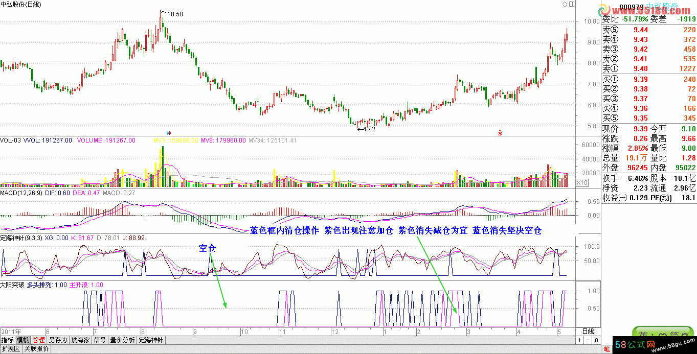 附件中的指标是基于移动平均线和k线形态来编写的。用的时候在信号提示的基础上,结合其他指标来综合分析。 1,多头排列出现,可以轻仓介入 2,突破原来的平台则可以加大筹码 3,如果涨势不具备持续性,主升浪失效,主要减仓 4,如果均线出现空头,坚决空仓
