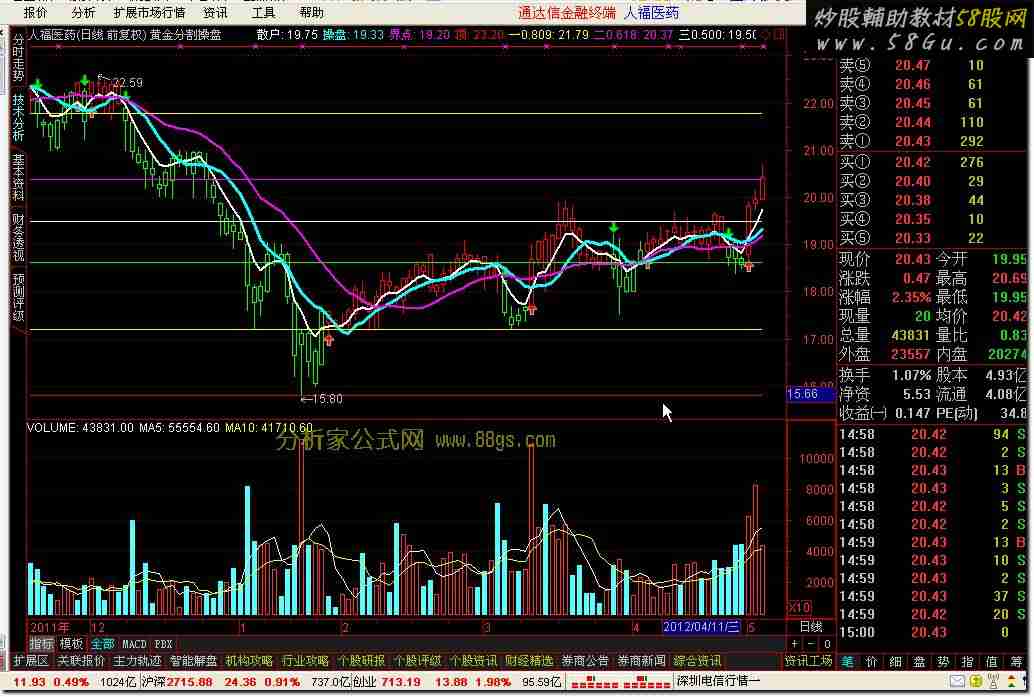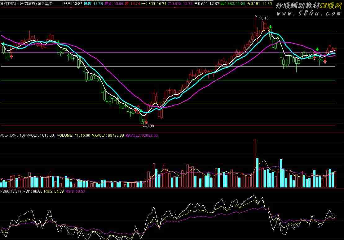 黄金分割操盘指标 1. 操盘线在界点线下方,建议不介入,减少风险(要做也视作短线反弹,散户线下穿操盘线时马上离场)。 2. K线为红色时以持股为主,绿色时以持币为主(仓位的控制,自己确定),散户线下穿操盘线离场,上穿再入。 3. 要是散户和操盘线同时上穿界点线,那你的运气来了! 买线:=EMA(C,2); 卖线:=EMA(SLOPE(C,21)*20+C,42); BU:=CROSS(买线,卖线); SEL:=CROSS(卖线,买线); DRAWICON(BU,L-0.1,1); DRAWICON(SEL,H+0.1,2); STICKLINE(买线>=卖线,LOW,HIGH,0.0,1),COLORRED; STICKLINE(买线>=卖线,CLOSE,OPEN,2,1),COLORRED; STICKLINE(买线<卖线,LOW,HIGH,0.0,1),COLORGREEN; STICKLINE(买线<卖线,CLOSE,OPEN,2,1),COLORGREEN; 散户:EMA(CLOSE,5),COLORWHITE,LINETHICK2; 操盘:MA(CLOSE,9),COLORCYAN,LINETHICK3; 界点:MA(CLOSE,20),COLORMAGENTA,LINETHICK2; LC:=REF(CLOSE,1); RSI:=((SMA(MAX((CLOSE - LC),0),3,1) / SMA(ABS((CLOSE - LC)),3,1)) * 100); FF:=EMA(CLOSE,3); MA15:=EMA(CLOSE,21); 日:=150;昨前:=3; 高1:=REF(HHV(H,日),昨前); 低1:=REF(LLV(L,日),昨前); H1:=高1-(高1-低1)*0.191; H2:=高1-(高1-低1)*0.382; H3:=高1-(高1-低1)*0.5; H4:=高1-(高1-低1)*0.618; H5:=高1-(高1-低1)*0.809; 顶:REFDATE(高1,DATE),COLORRED; 一0.809:REFDATE(H1,DATE),COLORYELLOW; 二0.618:REFDATE(H2,DATE),COLORMAGENTA; 三0.500:REFDATE(H3,DATE),COLORWHITE; 四0.382:REFDATE(H4,DATE),COLORGREEN; 五0.191:REFDATE(H5,DATE),COLORYELLOW; 低:REFDATE(低1,DATE),COLORRED; 用法说明:1. 操盘线在界点线下方,建议不介入,减少风险(要做也视作短线反弹,散户线下穿操盘线时马上离场)。2. K线为红色时以持股为主,绿色时以持币为主(仓位的控制,自己确定),散户线下穿操盘线离场,上穿再入。 要是散户和操盘线同时上穿界点线,那你的运气来了! |