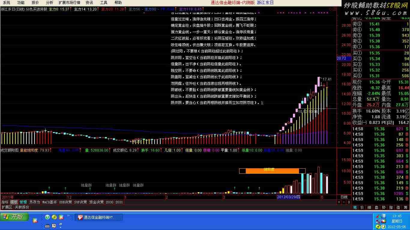A:=(O+C)/2; B:=(H+L)/2; AA:=MA(A,6); BB:=MA(B,6); 主力6:IF(AA>REF(BB,1),AA,DRAWNULL), STICK,COLORYELLOW,LINETHICK2; CC:=MA(A,14); DD:=MA(B,14); 主力14:IF(CC>REF(DD,1),CC,DRAWNULL), STICK,COLORWHITE,LINETHICK2; EE:=MA(A,20); FF:=MA(B,20); 主力20:IF(EE>REF(FF,1),EE,DRAWNULL), STICK,COLORRED,LINETHICK2; ZZ:=(A,56); QQ:=(B,56); 主力56:IF(ZZ>REF(QQ,1),ZZ,DRAWNULL), STICK, COLORA67D3D,LINETHICK2; WW:=(A,90); YY:=(B,90); 主力90:IF(WW>REF(YY,1),WW,DRAWNULL), STICK, COLORFF7F00,LINETHICK2; UU:=MA(A,118); PP:MA(B,118); 主力118:IF(UU>REF(PP,1),UU,DRAWNULL), STICK, COLORFF1CAE,LINETHICK2; STICKLINE(C/REF(C,1)>1.095,C,O,2,0),COLOREAADEA; HHH:=CONST(HHV(H,100)); LLL:=CONST(LLV(L,100)); HH:=HHH-LLL; TJ2:= CURRBARSCOUNT=58; DRAWTEXT(TJ2,LLL+HH*2.00,'百日低量处,倍量要涨停;凹口平量柱,确实猛如虎;'); DRAWTEXT(TJ2,LLL+HH*1.90,'倍量过左峰,涨停急先锋;凹口去淘金,报四三涨停;'); DRAWTEXT(TJ2,LLL+HH*1.80,'确定黄金柱,实盘擒牛股;回踩黄金线,腾飞不眨眼;'); DRAWTEXT(TJ2,LLL+HH*1.70,'接力黄金线,一步一重天;银谷黄金仓,涨停没商量;'); DRAWTEXT(TJ2,LLL+HH*1.60,'二次红波起,必有好戏看;长阴压短柱,攻势猛如虎;'); DRAWTEXT(TJ2,LLL+HH*1.50,'咬住峰顶线,伏击赚大钱;顶底若互换,牛股要逛奔。'); HHH1:=CONST(HHV(H,100));LLL1:=CONST(LLV(L,100));HH1:=HHH1-LLL1;TJ22:= CURRBARSCOUNT=58;DRAWTEXT(TJ22,LLL1+HH1*1.40,'{阴过阳,不要娘(当前阴柱超过此前阳柱);');DRAWTEXT(TJ22,LLL1+HH1*1.30,'阴并阳,宜空仓(当前阴柱并肩此前阳柱);');DRAWTEXT(TJ22,LLL1+HH1*1.20,'倍量阴,出干净(当前阴柱倍量此前阳柱)。');DRAWTEXT(TJ22,LLL1+HH1*1.10,'跳空阴,不要命(当前阴线跳离此前阳线);');DRAWTEXT(TJ22,LLL1+HH1*1.00,'阴盖阳,宜减仓(当前阴线长于此前阳线);');DRAWTEXT(TJ22,LLL1+HH1*0.90,'双阴露,往外吐(当前连续出现两根阴线)。'); DRAWTEXT(TJ22,LLL1+HH1*0.80,'阴破线,不要脸(当前阴线跌破重要量线如黄金线); ');DRAWTEXT(TJ22,LLL1+HH1*0.70,'阴出头,赶快走(当前阴线跌破重要支撑如平衡线);');DRAWTEXT(TJ22,LLL1+HH1*0.60,'阴并阴,要当心(当前两根阴线并肩而立如双阴双柱)。}; ');