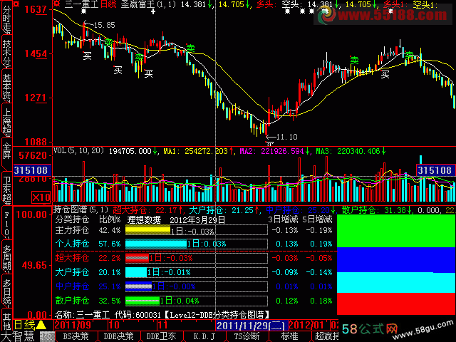 圣赢富王主图指标源码 参数设置N(1,100,12);M(1,100,26); DIFF:=EMA(CLOSE,N)-EMA(CLOSE,M); DEA:=EMA(DIFF,9); MA(C,8),COLORWHITE; MA(C,21),COLORYELLOW; 多头:STICKLINE(DIFF>DEA,C,O,3,-1),COLORRED; STICKLINE(DIFF>DEA,H,L,0,0),COLORWHITE; 空头:STICKLINE(DIFF<=DEA,C,O,3,0),COLORWHITE; STICKLINE(DIFF<=DEA,H,L,0,0),COLORWHITE; DRAWTEXT(CROSS(DIFF,DEA),L*0.98,'买'),COLORYELLOW; DRAWTEXT(CROSS(DEA,DIFF),H*1.02,'卖'),COLORGREEN; DIFF1:=EMA(CLOSE,12)-EMA(CLOSE,26); DEA1:=EMA(DIFF1,9); MA(C,8),COLORWHITE; MA(C,21),COLORYELLOW; 多头1:STICKLINE(DIFF1>DEA1,C,O,3,0),COLORRED; STICKLINE(DIFF>DEA1,H,L,0,0),COLORRED; 空头1:STICKLINE(DIFF1<=DEA1,C,O,3,0),COLORYELLOW; STICKLINE(DIFF1<=DEA1,H,L,0,0),COLORYELLOW; DRAWTEXT(CROSS(DIFF1,DEA1),L*0.98,'买'),COLORWHITE; DRAWTEXT(CROSS(DEA1,DIFF1),H*1.02,'卖'),COLORGREEN;说明:主图有买卖提示,结合附图使用。附图