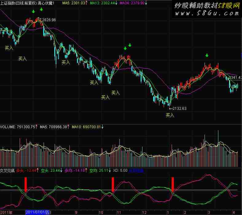 寻找底部的指标,出现红柱时要加以关注,对大盘的警示最佳,个股较敏感。至于底部的级别要自己观察