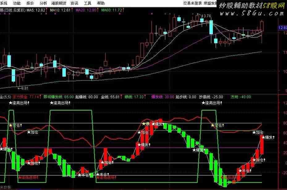 【通达信】主力资金线(爆发线、起爆线、主力资金、抄底线)-指标指标效果图 N1:=5; N2:=5;主力资金:EMA(100*(C-LLV(LOW,30))/(HHV(H,30)-LLV(LOW,30)),3), COLORRED,LINETHICK2; 即将爆发线: 65,COLOR00FF00; 起爆线:80,COLORWHITE,LINETHICK1; DRAWTEXT(CROSS(主力资金,起爆线),主力资金,'★爆发!') ,COLORYELLOW; TMD:=C-REF(C,1); 金线:100*EMA(EMA(TMD,N1),N1)/EMA(EMA(ABS(TMD),N1),N1),COLORWHITE,LINETHICK1; 银线:MA(金线,N2),COLOR00FF00,LINETHICK1; STICKLINE(金线>银线 , 金线,银线 ,2.5,0),COLORRED,LINETHICK2; STICKLINE(银线>金线,金线,银线,2.5,0),COLORGREEN,LINETHICK2; 爆发线:30,COLORFF00FF,LINETHICK1; 起步线:0,COLORWHITE,LINETHICK1; DRAWTEXT(CROSS(起爆线,主力资金),起爆线,'★空仓!') ,COLORYELLOW; 抄底线:-25,COLORWHITE,LINETHICK1; DRAWTEXT(CROSS(金线,爆发线),金线,'★爆发!') ,COLORWHITE; DRAWTEXT(CROSS(主力资金,即将爆发线),主力资金,'★加仓') ,COLORWHITE; DRAWTEXT(CROSS(金线,起步线),金线,'★加仓!') ,COLORWHITE; DRAWTEXT(CROSS(金线,抄底线),金线,'★半仓!') ,COLORWHITE; LC:= REF(C,1); F1:=ZIG(3,10); 方向:IF((F1> REF(F1,1)),-40,105),COLOR00FF00,LINETHICK2; DRAWTEXT(CROSS(抄底线,方向),抄底线,'★逢低进场!') ,COLORRED; DRAWTEXT(CROSS(方向,抄底线),方向+20,'★逢高出场!') ,COLORWHITE; DRAWTEXT(CROSS(金线,起爆线),金线,'★爆发!') ,COLORWHITE;
