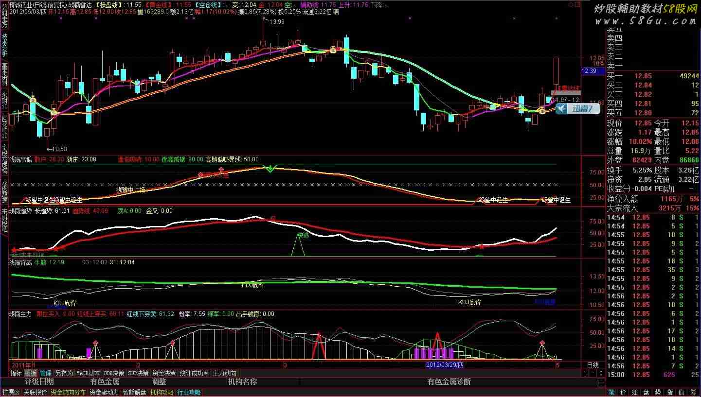 1.战赢主力: VARA:=REF(LOW,1); VARB:=SMA(ABS(LOW-VARA),3,1)/SMA(MAX(LOW-VARA,0),3,1)*100; VARC:=EMA(IF(CLOSE*1.3,VARB*10,VARB/10),3); VARD:=LLV(LOW,30); VARE:=HHV(VARC,30); VARF:=IF(MA(CLOSE,58),1,0); VARG:=EMA(IF(LOW<=VARD,(VARC+VARE*2)/2,0),3)/618*VARF; VARH:=IF(VARG>28,28,VARG); 吸筹:STICKLINE(VARH>-120,0,VARH,6,1),COLOR0FFFFF;RSV:=(((CLOSE - LLV(LOW,9)) / (HHV(HIGH,9) - LLV(LOW,9))) * 100); K:=SMA(RSV,3,1); D:=SMA(K,3,1); J:=3*K-2*D; X:=LLV(J,2)=LLV(J,8); 跟庄买入: IF(CROSS(J,3),50,0),COLORRED,LINETHICK3;VA:=(2*C+H+L)/4; VB:=LLV(L,5); VC:=HHV(H,5); 红线上穿买:EMA((VA-VB)/(VC-VB)*100,5),COLORRED; 红线下穿卖:EMA(红线上穿买,3),COLORFFFF00; JL:=EMA(VOL,13); JE:=EMA(AMOUNT,13); JX:=((JE / JL) / 100); RGL:=(((CLOSE - JX) / JX) * 100); STICKLINE((RGL < (0 - 6)),0,20,2,0),COLORFF00CC; V1:=MA(100*(CLOSE-LLV(CLOSE,34))/(HHV(HIGH,34)-LLV(LOW,34)),5)-20; V2:=2*ABS(V1); 粉军:IF(V1>0,V1,0),COLORFFCCFF, LINESTICK; 绿军:IF(V1<0,V2,0),COLORGREEN,LINESTICK;K1:=SMA(RSV,3,1); DK1:=K1-REF(K1,1); 出手就赢:IF(DK1>7 AND REF(DK1,1)<0 AND (DK1-REF(DK1,1))>9,30,0), LINESTICK,COLORYELLOW; DRAWICON(出手就赢>0,30 ,1);2.战赢趋势: Q2:=(CLOSE-LLV(LOW, 18))/(HHV(HIGH, 18)-LLV(LOW, 18))*100; Q3:=SMA(Q2, 9, 1); Q4:=SMA(Q3, 3, 1); 长趋势:3*Q3-2*Q4,COLORWHITE,LINETHICK3; 趋势线:EMA(Q3, 3),COLORRED,LINETHICK3; DRAWTEXT(CROSS(趋势线, 长趋势) AND REF(长趋势,1)>80, REF(长趋势,3), '顶'),COLORRED,LINETHICK5; 逢低买: DRAWTEXT(REF(CROSS(趋势线,长趋势),82) AND 趋势线>1.3*长趋势,长趋势,'逢低买'),LINETHICK1; 买: DRAWTEXT(REF(CROSS(长趋势,趋势线),1) AND 长趋势>1.3*趋势线,趋势线,'买'),COLORRED,LINETHICK1; VAR3:=PEAKBARS(3,15,1)<10; VAR5:=IF(VAR3=1,2,0); 顶:= IF(VAR5=2,2,0); 顶A:IF(顶>REF(顶,1),50,0),COLORGREEN; DRAWTEXT(顶A=50,45,'快逃'),COLOR00FF00; 金叉: CROSS(长趋势,趋势线); DRAWTEXT(金叉,趋势线,'★'),COLORRED;3.战赢高低: VAR1:=IF(DATE<1340830 AND DATE>900101,1,0); VAR2:=IF(MONTH<12,1,100000); VAR3:=(2*CLOSE+HIGH+LOW)/4; VAR4:=LLV(LOW,34); VAR5:=HHV(HIGH,34); 散户: EMA((VAR3-VAR4)/(VAR5-VAR4)*100,13),LINETHICK2,COLORRED; 新庄: EMA(0.667*REF(散户,1)+0.333*散户,2),LINETHICK2,COLORYELLOW; DRAWTEXT(CROSS(散户,新庄) AND 散户<22,20,'绝望中诞生'),COLORWHITE,LINETHICK7 ; DRAWICON(CROSS(散户,新庄) AND 散户<22,25,0); DRAWTEXT(CROSS(散户,30) AND 新庄<散户,40,'犹豫中上扬'),COLORYELLOW, LINETHICK4; DRAWICON(CROSS(散户,30) AND 新庄<散户,40,0); DRAWTEXT(CROSS(散户,65) AND 新庄<散户,70,'无奈中叹息'),COLORRED ,LINETHICK4 ; DRAWICON(CROSS(散户,65) AND 新庄<散户,70,1); DRAWICON(CROSS(散户,75) AND 新庄<散户,80,1); DRAWICON(CROSS(新庄,散户) AND 新庄>75,85,2); 逢低吸呐: IF(CROSS(散户,新庄) AND 散户<40,25,10),COLORRED,LINETHICK2; 逢高减磅: IF(CROSS(新庄,散户) AND 新庄>75,75,90),COLORGREEN,LINETHICK2; 高抛低吸界线: 50*VAR1, CROSSDOT;4.战赢风赢: FS:=MA(CLOSE,13)+MA(CLOSE,13)-REF(MA(CLOSE,13),1); CG:=IF(MA(CLOSE,13)<FS,FS,MA(CLOSE,13)); A:=CG-(EMA(C,3)-CG); X:=(20*A+19*REF(A,1)+18*REF(A,2)+17*REF(A,3)+16*REF(A,4)+15*REF(A,5)+14*REF(A,6)+13*REF(A,7)+12*REF(A,8)+11*REF(A,9)+10*REF(A,10)+9*REF(A,11)+8*REF(A,12)+7*REF(A,13)+6*REF(A,14)+5*REF(A,15)+4*REF(A,16)+3*REF(A,17)+2*REF(A,18)+REF(A,20))/210; MTM:=C-REF(C,1); DX:=100*EMA(EMA(MTM,6),6)/EMA(EMA(ABS(MTM),6),6); 卖1:=IF(HHV(DX,2)=HHV(DX,7) AND COUNT(DX>50,2) AND CROSS(MA(DX,2),DX),1,0); DRAWICON(FILTER(卖1=1,1),H*1.01,6); 买1:=IF(LLV(DX,2)=LLV(DX,7) AND COUNT(DX<0,2) AND CROSS(DX,MA(DX,2)),1,0); DRAWICON(FILTER(买1=1,5),L*0.96,5); 日均价:=(C*3+H+L+O)/6; ZIA:=日均价; 裁决:=(REF(ZIA,1)*0.5+REF(ZIA,2)+REF(ZIA,3)*0.5)/2; VAR1:=IF(C<裁决 AND BETWEEN(裁决,C,O),1,0); VAR2:=IF(C<裁决 AND REF(C,1)>裁决 AND BETWEEN(裁决,C,O)=0,1,0); VAR3:=IF(C<裁决 AND REF(C,1)>裁决 ,1,0); VAR4:=IF(C>=裁决 AND BETWEEN(裁决,C,O),1,0); VAR5:=IF(C>=裁决 AND REF(C,1)>裁决,1,0); VAR6:=IF(C>=裁决 AND BETWEEN(裁决,C,O)=0 AND REF(C,1)>裁决,1,0); CO:=(C-O);捕风:MA(C,5)-MA(C,13)+MA(C,8),COLORYELLOW,LINETHICK1; 修正:=SMA(SMA(EMA(日均价,5)*2-MA(日均价,5),3,1),3,1); 补偿:=FLOOR(((修正-MA(修正,5))/MA(修正,5)*100)); SA:=EMA(日均价,5)*2-MA(日均价,5); 捉影:SMA(SMA((EMA(SA,(5+ABS(补偿)))),2,1),2,1),COLORMAGENTA,LINETHICK2; 捉影角度:ATAN((捉影/REF(捉影,1)-1)*100)*57.3,NODRAW,COLORYELLOW; 分界:MA(C,64),COLORFF9900; 分界角度:ATAN((分界/REF(分界,1)-1)*100)*57.3,NODRAW,COLORFF9900; 买点A:FILTER(买1=1,5),COLORGRAY,NODRAW; 买点B:VAR4,COLORGRAY,NODRAW; 涨幅:(CLOSE-REF(CLOSE,1))/REF(CLOSE,1)*100,COLORMAGENTA,NODRAW; 换手:SUM(100*V/CAPITAL,1),COLORFF9900,NODRAW; STICKLINE(CLOSE> REF(CLOSE,1) ,HIGH,LOW,0,1 ),COLORRED; STICKLINE(CLOSE> REF(CLOSE,1) ,OPEN,CLOSE,3,0 ),COLOR000055; STICKLINE(CLOSE> REF(CLOSE,1) ,OPEN,CLOSE,2.7,0 ),COLOR000077; STICKLINE(CLOSE> REF(CLOSE,1) ,OPEN,CLOSE,2.1,0 ),COLOR000099; STICKLINE(CLOSE> REF(CLOSE,1) ,OPEN,CLOSE,1.5,0 ),COLOR0000BB; STICKLINE(CLOSE> REF(CLOSE,1) ,OPEN,CLOSE,0.9,0 ),COLOR0000DD; STICKLINE(CLOSE> REF(CLOSE,1) ,OPEN,CLOSE,0.3,0 ),COLOR0000FF; STICKLINE(CLOSE= REF(CLOSE,1) ,HIGH,LOW,0,1 ),COLORWHITE; STICKLINE(CLOSE= REF(CLOSE,1) ,OPEN,CLOSE,3,0 ),COLOR555555; STICKLINE(CLOSE= REF(CLOSE,1) ,OPEN,CLOSE,2.7,0 ),COLOR777777; STICKLINE(CLOSE= REF(CLOSE,1) ,OPEN,CLOSE,2.1,0 ),COLOR999999; STICKLINE(CLOSE= REF(CLOSE,1) ,OPEN,CLOSE,1.5,0 ),COLORBBBBBB; STICKLINE(CLOSE= REF(CLOSE,1) ,OPEN,CLOSE,0.9,0 ),COLORDDDDDD; STICKLINE(CLOSE= REF(CLOSE,1) ,OPEN,CLOSE,0.3,0 ),COLORFFFFFF; STICKLINE(CLOSE< REF(CLOSE,1) ,HIGH,LOW,0,1 ),COLORCYAN; STICKLINE(CLOSE< REF(CLOSE,1) ,OPEN,CLOSE,3,0 ),COLOR990000; STICKLINE(CLOSE< REF(CLOSE,1) ,OPEN,CLOSE,2.7,0 ),COLORCC0000; STICKLINE(CLOSE< REF(CLOSE,1) ,OPEN,CLOSE,2.1,0 ),COLORFF4400; STICKLINE(CLOSE< REF(CLOSE,1) ,OPEN,CLOSE,1.5,0 ),COLORFF8800; STICKLINE(CLOSE< REF(CLOSE,1) ,OPEN,CLOSE,0.9,0 ),COLORFFCC00; STICKLINE(CLOSE< REF(CLOSE,1) ,OPEN,CLOSE,0.3,0 ),COLORCYAN;STICKLINE(VAR5 OR