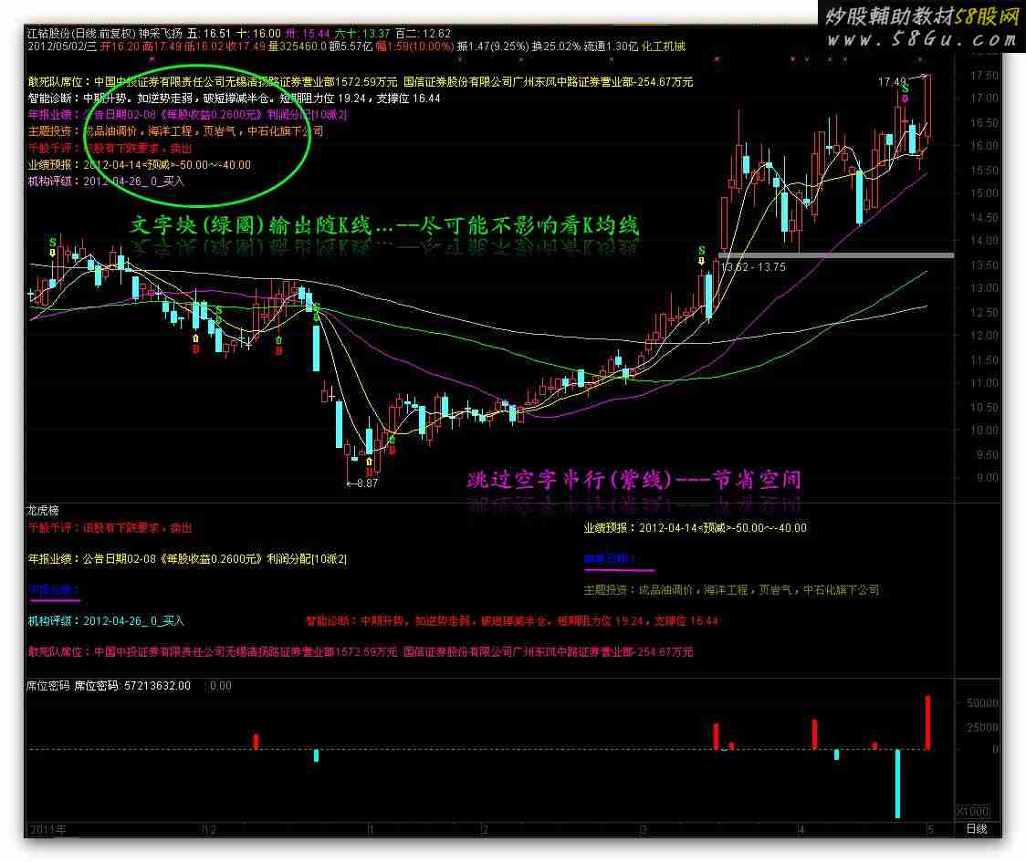 {神采飞扬} 五:MA(C,5); 十:MA(C,10); 卅:MA(C,30); 六十:MA(C,60); 百二:MA(C,120);N:=IF(TOTALBARSCOUNT>=120,120,TOTALBARSCOUNT); {本输出适用于锁定K线数为120,N可改为你习惯的K线数,见下图} HH0:=HHV(H,N); LL0:=LLV(L,N); MM0:=CONST((HH0+LL0)*0.5); T1:=IF(FINDSTR(EXTERNSTR(0,13),'万元'),STRCAT('敢死队席位:',EXTERNSTR(0,13)),''); T2:=IF(FINDSTR(EXTERNSTR(0,12),'。'),STRCAT('智能诊断:',EXTERNSTR(0,12)),''); T3:=IF(FINDSTR(EXTERNSTR(0,8),'公告'),STRCAT('年报业绩:',EXTERNSTR(0,8)),''); T4:=IF(FINDSTR(EXTERNSTR(0,10),','),STRCAT('主题投资:',EXTERNSTR(0,10)),''); T5:=IF(FINDSTR(EXTERNSTR(0,15),'-'),STRCAT('解禁日期:',EXTERNSTR(0,15)),''); T6:=IF(FINDSTR(EXTERNSTR(0,1),','),STRCAT('千股千评:',EXTERNSTR(0,1)),''); T7:=IF(FINDSTR(EXTERNSTR(0,14),'-'),STRCAT('业绩预报:',EXTERNSTR(0,14)),''); T8:=IF(FINDSTR(EXTERNSTR(0,11),'-'),STRCAT('机构评级:',EXTERNSTR(0,11)),''); T9:=IF(FINDSTR(EXTERNSTR(0,9),'-'),STRCAT('中报业绩:',EXTERNSTR(0,9)),''); S01:=CONST(IF(REF(C,N-15)>MM0,1.00,-0.04)); S02:=CONST(IF(REF(C,N-15)>MM0,-1,1)); S1:=IF(FINDSTR(EXTERNSTR(0,13),'万元'),S01+(0.04*S02),S01); S2:=IF(FINDSTR(EXTERNSTR(0,12),'。'),S1+(0.04*S02),S1); S3:=IF(FINDSTR(EXTERNSTR(0,8),'公告'),S2+(0.04*S02),S2); S4:=IF(FINDSTR(EXTERNSTR(0,10),','),S3+(0.04*S02),S3); S5:=IF(FINDSTR(EXTERNSTR(0,15),'-'),S4+(0.04*S02),S4); S6:=IF(FINDSTR(EXTERNSTR(0,1),','),S5+(0.04*S02),S5); S7:=IF(FINDSTR(EXTERNSTR(0,14),'-'),S6+(0.04*S02),S6); S8:=IF(FINDSTR(EXTERNSTR(0,11),'-'),S7+(0.04*S02),S7); S9:=IF(FINDSTR(EXTERNSTR(0,9),'-'),S8+(0.04*S02),S8); {WWWW.88GS.COM} DRAWTEXT_FIX(1,0,S1,0,T1)COLOR00FFFF; DRAWTEXT_FIX(1,0,S2,0,T2)COLORFFFFFF; DRAWTEXT_FIX(1,0,S3,0,T3)COLORFF00FF; DRAWTEXT_FIX(1,0,S4,0,T4)COLOR0088FF; DRAWTEXT_FIX(1,0,S5,0,T5)COLOR00FF00; DRAWTEXT_FIX(1,0,S6,0,T6)COLOR0000FF; DRAWTEXT_FIX(1,0,S7,0,T7)COLOR00CCFF; DRAWTEXT_FIX(1,0,S8,0,T8)COLORFF88FF; DRAWTEXT_FIX(1,0,S9,0,T9)COLORBBFFFF;