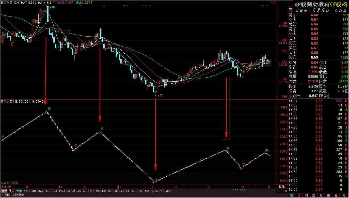 VAR1:=SUM(MAX(MAX(HIGH-LOW,ABS(HIGH-REF(CLOSE,1))),ABS(LOW-REF(CLOSE,1))),25); VAR2:=HIGH-REF(HIGH,1); VAR3:=REF(LOW,1)-LOW; VAR4:=SUM(IF(VAR2>0 AND VAR2>VAR3,VAR2,0),25); VAR5:=SUM(IF(VAR3>0 AND VAR3>VAR2,VAR3,0),25); VAR6:=VAR4*100/VAR1; VAR7:=VAR5*100/VAR1; VAR8:=MA(ABS(VAR7-VAR6)/(VAR7+VAR6)*100,15); VAR9:=(VAR8+REF(VAR8,15))/2; A:=(VAR7>VAR6 AND VAR7>25 AND VAR6<25); B:ZIG(3,50/5)*100,COLORWHITE; G:MA(B,2),COLORYELLOW; D:=CROSS(B,G)*1000,COLORRED; W:=CROSS(G,B)*1000,COLORBLUE; E:=REF(INDEXC,1); F:=SMA(MAX(INDEXC-E,0),3,1)/SMA(ABS(INDEXC-E),3,1); VAR10:=F AND F<8; VAR11:=(CLOSE-LLV(LOW,9))/(HHV(HIGH,9)-LLV(LOW,9))*100; VAR12:=SMA(VAR11,3,1); VAR13:=SMA(VAR12,3,1); VAR14:=VAR13 AND VAR13<20; MM:=A AND D AND VAR10 AND VAR14 ; DRAWTEXT(W=1000,B*1.05,'卖' ),COLORGREEN; DRAWTEXT(D=1000,B*1.05,'买'),COLORRED;