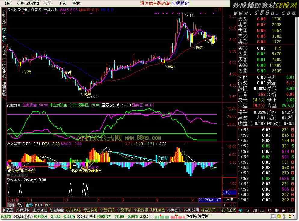 十战八胜主图公式十战八胜 MAA5:MA(C,5),COLORFF00FF,LINETHICK2; MAA10:=MA(C,10); MAA30:MA(C,30),COLORRED; KS:IF(MAA10>MAA30,MAA10,MAA30),COLORBLUE; A3:=(C-LLV(L,9))/(HHV(H,9)-LLV(L,9))*100; A4:=SMA(A3,3,1); A5:=SMA(A4,3,1); A6:=3*A4-2*A5; A7:=C-REF(C,1); A8:=100*EMA(EMA(A7,6),6)/EMA(EMA(ABS(A7),6),6); 买:=LLV(A8,2)=LLV(A8,7) AND COUNT(A8<0,2) AND CROSS(A8,MA(A8,2)); DRAWTEXT(FILTER(买=1,5),LOW-0.05,'↖买进'),COLORYELLOW; STICKLINE(买,OPEN,CLOSE,2,0),COLORYELLOW;资金流向(副图) 主流资金:EMA(100*(C-LLV(LOW,34))/(HHV(H,34)-LLV(LOW,34)),3), COLORMAGENTA,LINETHICK2; 非主流资金:EMA(100*(INDEXC-LLV(INDEXL,34))/(HHV(INDEXH,34)-LLV(INDEXL,34)),3),COLORGREEN,LINETHICK2; 弱势区:20,COLORGREEN,LINETHICK2; 强弱分水岭:50,COLORWHITE,LINETHICK2; 强势区:80,COLORF00FF0,LINETHICK2;金叉背离A:=VOL*CLOSE; B:=SUM(A,1)/SUM(VOL,1); B1:=EMA(B,17); 资金:=(B-B1)*100/B; DIFF : EMA(资金,5) - EMA(资金,34); DEA : EMA(DIFF,9); MACD : 2*(DIFF-DEA), COLORSTICK; STICKLINE(MACD>=0,MACD,0,4,1),COLORF00FF0; STICKLINE(MACD<0,MACD,0,3.1,1),COLORWHITE; STICKLINE(MACD<REF(MACD,1)AND MACD>0,0,MACD,3,0 ),COLOR00AAFF; STICKLINE(MACD<REF(MACD,1)AND MACD>0,0,MACD,2.2,0 ),COLOR00BBFF; STICKLINE(MACD<REF(MACD,1)AND MACD>0,0,MACD,1.8,0 ),COLOR00CCFF; STICKLINE(MACD<REF(MACD,1)AND MACD>0,0,MACD,1.3,0 ),COLOR00DDFF; STICKLINE(MACD<REF(MACD,1)AND MACD>0,0,MACD,0.9,0 ),COLOR00EEFF; STICKLINE(MACD<REF(MACD,1)AND MACD>0,0,MACD,0.5,0 ),COLOR00FFFF; STICKLINE(MACD>=REF(MACD,1)AND MACD>0,0,MACD,4 ,0 ),COLOR0000AA; STICKLINE(MACD>=REF(MACD,1)AND MACD>0,0,MACD,3.3 ,0 ),COLOR0011BB; STICKLINE(MACD>=REF(MACD,1)AND MACD>0,0,MACD,2.2,0 ),COLOR0022CC; STICKLINE(MACD>=REF(MACD,1)AND MACD>0,0,MACD,1.65 ,0 ),COLOR0033DD; STICKLINE(MACD>=REF(MACD,1)AND MACD>0,0,MACD,1.1 ,0 ),COLOR0044EE; STICKLINE(MACD>=REF(MACD,1)AND MACD>0,0,MACD,0.55 ,0 ),COLOR0055FF; STICKLINE(MACD>REF(MACD,1)AND MACD<0,0,MACD,4,0 ),COLORAA00BB; STICKLINE(MACD>REF(MACD,1)AND MACD<0,0,MACD,3.3 ,0 ),COLORBB11BB; STICKLINE(MACD>REF(MACD,1)AND MACD<0,0,MACD,2.2,0 ),COLORCC22BB; STICKLINE(MACD>REF(MACD,1)AND MACD<0,0,MACD,1.65,0 ),COLORDD33BB; STICKLINE(MACD>REF(MACD,1)AND MACD<0,0,MACD,1.1,0 ),COLOREE44BB; STICKLINE(MACD>REF(MACD,1)AND MACD<0,0,MACD,0.55 ,0 ),COLORFF55BB; STICKLINE(MACD<=REF(MACD,1)AND MACD<0,0,MACD,4,0 ),COLORFFAA00; STICKLINE(MACD<=REF(MACD,1)AND MACD<0,0,MACD,3.3 ,0 ),COLORFFBB11; STICKLINE(MACD<=REF(MACD,1)AND MACD<0,0,MACD,2.2,0 ),COLORFFCC22; STICKLINE(MACD<=REF(MACD,1)AND MACD<0,0,MACD,1.65 ,0 ),COLORFFDD33; STICKLINE(MACD<=REF(MACD,1)AND MACD<0,0,MACD,1.1 ,0 ),COLORFFEE44; STICKLINE(MACD<=REF(MACD,1)AND MACD<0,0,MACD,0.55 ,0 ),COLORFFFF55; IF(DIFF<0,DIFF,0),COLORRED,LINETHICK1; IF(DIFF<0,0,DIFF),COLORYELLOW,LINETHICK1; IF(DIFF<DEA,DIFF,DEA),COLOR00FF00,LINETHICK1; IF(DIFF>DEA,DEA,DEA),COLORWHITE,LINETHICK1; 低位金叉:=CROSS(DIFF,DEA) AND DIFF<-0.1; STICKLINE(低位金叉,0,-4.5,2,0),COLORYELLOW; DRAWTEXT(低位金叉,-4,' 低位金叉'),COLORYELLOW; JCCOUNT:=COUNT(CROSS(DIFF,DEA),BARSLAST(DEA>=0)); 二次金叉:=CROSS(DIFF,DEA) AND DEA<0 AND COUNT(JCCOUNT=2,21)=1; STICKLINE(二次金叉,0,-2.5,5,0),COLORFF00FF; DRAWICON(二次金叉,DEA*1.2,11) ; DRAWTEXT(二次金叉,-2,' 二次金叉'),COLORFF00FF; A1:=BARSLAST(REF(CROSS(DIFF,DEA),1)); 底背离:=REF(CLOSE,A1+1)>CLOSE AND DIFF>REF(DIFF,A1+1) AND CROSS(DIFF,DEA); STICKLINE(底背离,0,2.5,3,0),COLOR00FF00; DRAWLINE(A1=0,DEA,底背离,DEA,0),COLORRED,LINETHICK2; DRAWTEXT(底背离,2,' 底背离'),COLOR00FF00; A2:=BARSLAST(REF(CROSS(DEA,DIFF),1)); 顶背离:=REF(CLOSE,A2+1)<CLOSE AND REF(DIFF,A2+1)>DIFF AND CROSS(DEA,DIFF); STICKLINE(顶背离,0,4.5,3,0),COLORFFFF00; DRAWLINE(A2=0,DEA,顶背离,DEA,0),COLORFFFF00,LINETHICK2; DRAWTEXT(顶背离,4,' 顶背离'),COLORFFFF00;低位金叉 A:=VOL*CLOSE; B:=SUM(A,1)/SUM(VOL,1); B1:=EMA(B,17); 资金:=(B-B1)*100/B; DIFF:=EMA(资金,5) - EMA(资金,34); DEA:=EMA(DIFF,9); 低位金叉:CROSS(DIFF,DEA) AND DIFF<-0.1;   |