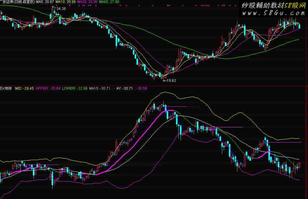 C1:=REVERSE(C); DRAWKLINE(-LOW, -OPEN, -HIGH, -CLOSE);MID : MA(C1,26); UPPER: MID + 2*STD(C1,26); LOWER: MID - 2*STD(C1,26); MA15:MA(C1,15); IF(MA15>REF(MA15,1),MA15,DRAWNULL),LINETHICK3,COLORMAGENTA;AY:MA(C1,4); A3:=REF(AY,10)=HHV(AY,2*10+1); B3:=FILTER(A3,10); C3:=BACKSET(B3,10+1); AD:=FILTER(C3,10); A4:=REF(AY,10)=LLV(AY,2*10+1); B4:=FILTER(A4,10); C4:=BACKSET(B4,10+1); CD:=FILTER(C4,10); E:=REF(AY,BARSLAST(AD)); F:=REF(AY,BARSLAST(CD)); T3:=BARSLAST(AD)<BARSLAST(CD) AND NOT(AD) ; T4:=BARSLAST(AD)>BARSLAST(CD) AND NOT(CD); IF(T3,E,E),COLORFF00FF,POINTDOT; STICKLINE(T3,E,E,10,0),COLORFF00FF;