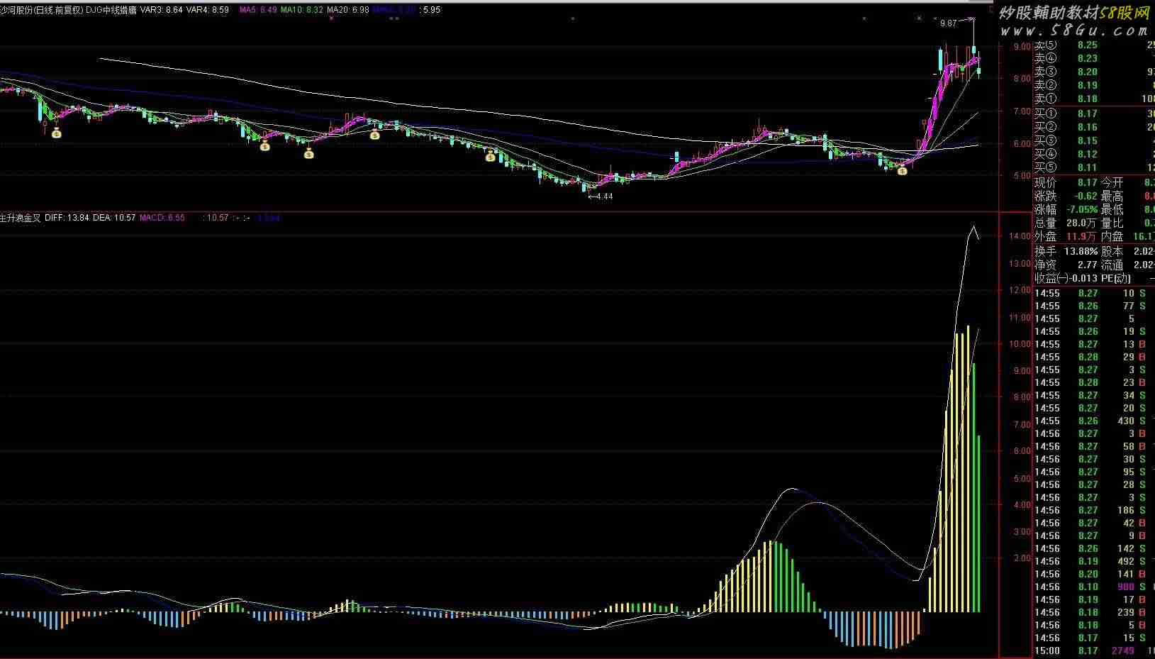 OBV:=MA(SUM(IF(CLOSE>REF(CLOSE,1),VOL,IF(CLOSE<REF(CLOSE,1),-VOL,0)),0)/25000,1); OBVE:=EMA(OBV,3); DIFF : EMA(OBVE,12) - EMA(OBVE,26); BBDIFF:=DIFF-REF(DIFF,1); DEA : EMA(DIFF,9); BBDEA:=DEA-REF(DEA,1); MACD : 2*(DIFF-DEA), COLORSTICK; STICKLINE(MACD<REF(MACD,1)AND MACD>0,0,MACD,1,0),COLORGREEN; STICKLINE(MACD<REF(MACD,1)AND MACD<0,0,MACD,1,0),COLORFFCC33; STICKLINE(MACD>REF(MACD,1)AND MACD<0,0,MACD,1,0),COLOR0099FF; STICKLINE(MACD>REF(MACD,1)AND MACD>0,0,MACD,1,0),COLORYELLOW; IF(BBDEA>0,DEA,DRAWNULL),COLOR9966CC; IF(BBDEA<0,DEA,DRAWNULL),COLOR00FF33; IF(BBDIFF>0,DIFF,DRAWNULL),COLORWHITE; IF(BBDIFF<0,DIFF,DRAWNULL),COLORBLUE; |