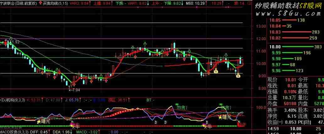 VAR2:MA(C,5),COLORRED,LINETHICK3; 上翘:IF(VAR2>REF(VAR2,1),VAR2,DRAWNULL),COLORRED,LINETHICK3; 下拐:IF(VAR2<REF(VAR2,1),VAR2,DRAWNULL),COLORGREEN,LINETHICK3; VAR1:MA(C,20),COLORRED; 上升:IF(VAR1>REF(VAR1,1),VAR1,DRAWNULL),COLORRED; 下降:IF(VAR1<REF(VAR1,1),VAR1,DRAWNULL),COLORGREEN; M60:MA(C,60),COLORWHITE POINTDOT; IF(M60>=REF(M60,1),M60,DRAWNULL),LINETHICK2,COLORRED; IF(M60<=REF(M60,1),M60,DRAWNULL),LINETHICK1,COLORCC9900; DIFF:=EMA(CLOSE,12)-EMA(CLOSE,26); DEA:=EMA(DIFF,9); MACD:=2*(DIFF-DEA); MACD1:=CROSS(DIFF,DEA) AND COUNT(MACD>0,1)=1; RSV:=(CLOSE-LLV(LOW,9))/(HHV(HIGH,9)-LLV(LOW,9))*100; K:=SMA(RSV,9,1); D:=SMA(K,9,1); J:=3*K-2*D; KDJ1:=CROSS(K,D) AND CROSS(J,D); 均线:=CROSS(MA(C,5),MA(C,10)); 量线:=CROSS(MA(V,5),MA(V,10)); SCC:=MACD1 AND KDJ1 AND 均线 AND 量线; SC1:=MACD1 AND KDJ1; SC2:=均线 AND 量线; SC3:=均线 AND MACD1; SC4:=量线 AND KDJ1; SC5:=均线 AND KDJ1; SC6:=MACD1 AND 量线; DRAWICON(SC1 OR SC2 OR SC3 OR SC4 OR SC5 OR SC6,L-0.20,9);{两个以上指标同时金叉显示9号图标} DRAWICON(SCC,L-0.20,3);{四个指标同时金叉显示3号图标,便于区别}LC:=REF(CLOSE,1); RSI:=((SMA(MAX((CLOSE - LC),0),3,1) / SMA(ABS((CLOSE - LC)),3,1)) * 100); FF:=EMA(CLOSE,3); MA15:=EMA(CLOSE,21); 日:=150;昨前:=3; 高1:=REF(HHV(H,日),昨前); 低1:=REF(LLV(L,日),昨前); H1:=高1-(高1-低1)*0.191; H2:=高1-(高1-低1)*0.382; H3:=高1-(高1-低1)*0.5; H4:=高1-(高1-低1)*0.618; H5:=高1-(高1-低1)*0.809; 顶:REFDATE(高1,DATE),COLORRED; 一0.809:REFDATE(H1,DATE),COLORYELLOW; 二0.618:REFDATE(H2,DATE),COLORMAGENTA; 三0.500:REFDATE(H3,DATE),COLORWHITE; 四0.382:REFDATE(H4,DATE),COLORGREEN; 五0.191:REFDATE(H5,DATE),COLORYELLOW; 低:REFDATE(低1,DATE),COLORRED; DRAWICON(C<MA(C,250) AND C>MA(C,10) AND REF(C,1)<REF(O,1)*0.97 AND C/O>1.03 AND V/CAPITAL>0.03,L*0.97,9); |