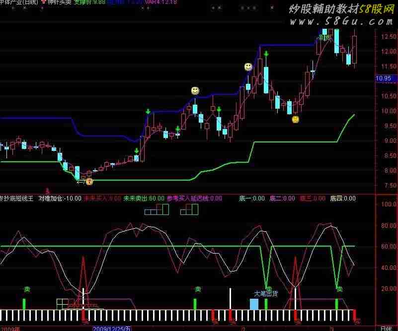 V1:=MA(C,3)=HHV(MA(C,3),7); V2:=MA(C,3)>MA(C,5); LC20:=REF(CLOSE,1); RSI20:=SMA(MAX(CLOSE-LC20,0),4.1,1)/SMA(ABS(CLOSE-LC20),4.1,1)*100; STICKLINE(CROSS(RSI20,11)*1,-10,20,2,0),COLORYELLOW; VAR3A:=3; VAR2A:=3*SMA((CLOSE-LLV(LOW,27))/(HHV(HIGH,27)-LLV(LOW,27))*100,5,1)-2*SMA(SMA((CLOSE-LLV(LOW,27))/(HHV(HIGH,27)-LLV(LOW,27))*100,5,1),3,1); MTM:=C-REF(C,1); DX:=100*EMA(EMA(MTM,6),6)/EMA(EMA(ABS(MTM),6),6); YXF:=IF(LLV(DX,2)=LLV(DX,7) AND COUNT(DX<0,2) AND CROSS(DX,MA(DX,2)),1,0); 加仓:IF(FILTER(YXF=1,5),20,-10),STICK,LINETHICK3; A51:=3*SMA((C-LLV(L,55))/(HHV(H,55)-LLV(L,55))*100,5,1)-2*SMA((C-LLV(L,55))/(HHV(H,55)-LLV (L,55))*100,5,1); FY:=EMA(A51,5); A54:=((C-LLV(L,21))/(HHV(H,21)-LLV(L,21)))*100; VAR2:=TROUGHBARS(3,15,1)<10; VAR3:=PEAKBARS(3,15,1)<5; VAR4:=IF(VAR2=1,50,0); VAR5:=IF(VAR3=1,50,0); 底部:=IF(VAR4=50,10,0); 头部:=IF(VAR5=50,20,60); 未来买入:IF(底部=10 AND REF(底部,1)=10 AND REF(底部,2)=0,50,0),COLOR0000CC,LINETHICK2; 未来卖出:IF(头部=20 AND REF(头部,1)=20 AND REF(头部,2)=60,20,60),COLORGREEN,LINETHICK2; 参考买入延迟线:底部,LINETHICK1 ,COLORMAGENTA; LT:=100; LU:=0; LV:=38.2; LA:=REF(CLOSE,1); LB:=((SMA(MAX((CLOSE - LA),0),5,1) / SMA(ABS((CLOSE - LA)),5,1)) * 100); LC:=(HIGH - REF(HIGH,1)); LD:=(REF(LOW,1) - LOW); LE:=SUM(MAX(MAX((HIGH - LOW),ABS((HIGH - REF(CLOSE,1)))),ABS((LOW - REF(CLOSE,1)))),10); LF:=SUM(IF(((LC > 0) AND (LC > LD)),LC,0),10); LG:=SUM(IF(((LD > 0) AND (LD > LC)),LD,0),10); LH:=((LF * 100) / LE); LI:=((LG * 100) / LE); LJ:=MA(((ABS((LI - LH)) / (LI + LH)) * 100),5); AV:=(LB + LJ); LK:=((100 * (HHV(HIGH,10) - CLOSE)) / (HHV(HIGH,10) - LLV(LOW,10))); LL:=(LB - LK); LM:=(AV + LL); LO:=((((2 * CLOSE) + HIGH) + LOW) / 4); LP:=LLV(LOW,34); LQ:=HHV(HIGH,34); LR:=EMA((((LO - LP) / (LQ - LP)) * 100),13); LS:=EMA(((0.667 * REF(LR,1)) + (0.333 * LR)),2); 向导线:=LLV(LM,1); STICKLINE((向导线>225),95,90,4,1),COLORFFCC00; STICKLINE((向导线>235),100,95,4,1),COLORRED; STICKLINE(CROSS(235,向导线),100,90,4,1),COLOR00FF00; STICKLINE((LM<(0-1)),0,5,4,1),COLOR00FF00; STICKLINE((LM<(0-5)),5,10,4,1),COLORYELLOW; STICKLINE(CROSS(向导线,(0-3)),0,10,4,1),COLORRED; BIAS1:=(CLOSE-MA(CLOSE,6))/MA(CLOSE,6)*100; BIAS2:=(CLOSE-MA(CLOSE,12))/MA(CLOSE,12)*100; BIAS3:=(CLOSE-MA(CLOSE,24))/MA(CLOSE,24)*100; BIAS:=(BIAS1+2*BIAS2+3*BIAS3)/6; 乖离:=MA(BIAS,3); 底一:IF(乖离<-12 AND 乖离>=-18,-4,0), COLORCYAN,LINETHICK1; STICKLINE(乖离<-12 AND 乖离>=-18,2,0,6,0) , COLORCYAN; 底二:IF(乖离<-18,3,0),COLORFF35FF,LINETHICK1; STICKLINE(乖离<-18,3,0,6,0),COLORFF35FF; 底三:IF(乖离<-6,5,0),COLORRED,LINETHICK1; STICKLINE(乖离<-6,5,3,2,1),COLORRED; 底四:IF(乖离<-4.5,0,0),COLOR00FFFF,LINETHICK1; STICKLINE(乖离<-4.5,0,1,3,1),COLOR00FFFF; 买:=(ZIG(3,5)>REF(ZIG(3,5),1)) AND (REF(ZIG(3,5),1)<=REF(ZIG(3,5),2)) AND (REF(ZIG (3,5),2)<=REF(ZIG(3,5),3)); 卖:=(ZIG(3,5)<REF(ZIG(3,5),1)) AND (REF(ZIG(3,5),1)>=REF(ZIG(3,5),2)) AND (REF(ZIG (3,5),2)>=REF(ZIG(3,5),3)); STICKLINE((买=1),(-10),0,1,0),COLOR0000FF; DRAWTEXT((买=1),(-12),'买'),COLOR0000FF; STICKLINE((卖=1),10,0,1,0),COLOR00FF00; DRAWTEXT((卖=1),19,'卖'),COLOR00FF00; VARE:=MA(100*(CLOSE-LLV(CLOSE,34))/(HHV(HIGH,34)-LLV(LOW,34)),5)-20; VARF:=100-3*SMA((CLOSE-LLV(LOW,75))/(HHV(HIGH,75)-LLV(LOW,75))*100,20,1)+2*SMA(SMA ((CLOSE-LLV(LOW,75))/(HHV(HIGH,75)-LLV(LOW,75))*100,20,1),15,1); VAR10:=100-3*SMA((OPEN-LLV(LOW,75))/(HHV(HIGH,75)-LLV(LOW,75))*100,20,1)+2*SMA(SMA ((OPEN-LLV(LOW,75))/(HHV(HIGH,75)-LLV(LOW,75))*100,20,1),15,1); VAR11:=VARF<REF(VAR10,1) AND VOL>REF(VOL,1) AND CLOSE>REF(CLOSE,1); DRAWTEXT(VAR11 AND COUNT(VAR11,30)=1,15,'大资金活动'),LINETHICK1,COLORFF00FF; STICKLINE(VAR11 AND COUNT(VAR11,30)=1,1,10,5,0),COLORFF00FF; VAR12:=(HIGH+LOW+CLOSE)/3; VAR13:=(VAR12-MA(VAR12,14))/(0.015*AVEDEV(VAR12,14)); VAR14:=(VAR12-MA(VAR12,70))/(0.015*AVEDEV(VAR12,70)); VAR15:=IF(VAR13>=150 AND VAR13<200 AND VAR14>=150 AND VAR14<200,10,0); VAR16:=IF(VAR13<=-150 AND VAR13>-200 AND VAR14<=-150 AND VAR14>-200,-10,VAR15); VAR17:=(CLOSE-MA(CLOSE,13))/MA(CLOSE,13)*100; VAR18:=100-ABS(VAR17); VAR19:=IF(VAR18<90,VAR18,100); VAR1A:=IF(VARE>0,VARE,0); VAR1B:=IF(VAR14>=200 AND VAR13>=150,15,IF(VAR14<=-200 AND VAR13<=-150,-15,VAR16))+60; VAR1C:=VAR1A>48 AND VAR1B>60 AND VAR19<100; DRAWTEXT(VAR1C AND COUNT(VAR1C,30)=1,15,'大笔出货'),LINETHICK1,COLORFFCC66; STICKLINE(VAR1C AND COUNT(VAR1C,30)=1,0,10,5,0),COLORFFCC66; P1:=5; P2:=4; VARA:=LLV(LOW,P1); VARB:=HHV(HIGH,P1); K: EMA((CLOSE-VARA)/(VARB-VARA)*100,P2),COLORLIMAGENTA; D: EMA(0.667*REF(K,1)+0.333*K,2),COLORWHITE; |