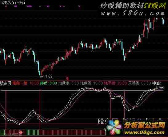 Q_1:=C-REF(C,1); Q_2:=100*EMA(EMA(Q_1,6),6)/EMA(EMA(ABS(Q_1),6),6); Q_3:=CROSS(EMA(C,19),EMA(C,7)); Q_4:=CROSS(EMA(C,7),EMA(C,19)); Z1:=L=LLV(L,BARSLAST(Q_3)+1); Z2:=LLV(L,BARSLAST(Q_3)+1); Z3:=H=HHV(H,BARSLAST(Q_4)+1); Z4:=HHV(H,BARSLAST(Q_4)+1); Q_A:=DRAWLINE(Z1,Z2,Z3,Z4,0); Y1:=H=HHV(H,BARSLAST(Q_4)+1); Y2:=HHV(H,BARSLAST(Q_4)+1); Y3:=L=LLV(L,BARSLAST(Q_3)+1); Y4:=LLV(L,BARSLAST(Q_3)+1); Q_B:=DRAWLINE(Y1,Y2,Y3,Y4,0); X1:=LLV(Q_2,2)=LLV(Q_2,7) ; X2:=COUNT(Q_2<0,2); X3:=CROSS(Q_2,MA(Q_2,2)); X4:=REF(Q_B,1)<REF(Q_B,2); X5:=Q_A>REF(Q_B,1); 买进:=(X1 AND X2 AND X3) AND X4 AND X5; TJ:=IF(Q_B<REF(Q_B,1) AND Q_B=Q_A,1,0); 堪称一绝:IF(REF(TJ,1)=0 AND TJ>=1,80,10),STICK,COLORRED; 持币:IF(Q_B<REF(Q_B,1) AND Q_B=Q_A,0,10),STICK,COLORGREEN; 地狱底:0,COLORGRAY; 地狱线:10,COLORGRAY; 地平线:20,COLORLIMAGENTA; 天际线:80,COLORGRAY; RSV:=(((CLOSE - LLV(LOW,33)) / (HHV(HIGH,33) - LLV(LOW,33))) * 100); 神仙:SMA(RSV,7,1),COLORWHITE; 魔鬼:SMA(SMA(RSV,7,1),3,1),COLORYELLOW; 轨迹:SMA(SMA(SMA(RSV,6,1),5,1),3,1),COLORMAGENTA; 财神到:IF(CROSS(神仙,20),20,0),POINTDOT; DRAWICON((CROSS(神仙,20)),5,1); {点击看本软件截图: 58股票 公式网 http://www. 58gu. com 整理} |