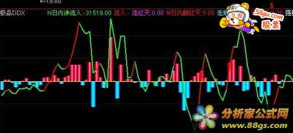 极品DDX(买量、进出量、卖量)AA:=VOL/((HIGH-LOW)*2-ABS(CLOSE-OPEN)); 买量:=IF(CLOSE>OPEN,AA*(HIGH-LOW),IF(CLOSE<OPEN,AA*((HIGH-OPEN)+(CLOSE-LOW)),VOL/2)),LINETHICK0,COLORRED; 卖量:=IF(CLOSE>OPEN,0-AA*((HIGH-CLOSE)+(OPEN-LOW)),IF(CLOSE<OPEN,0-AA*(HIGH-LOW),0-VOL/2)),LINETHICK0,COLORCYAN; 进出量:=买量+卖量,COLOR00FFFF;STICKLINE(进出量<0,0,进出量,4,0),COLORFF6600; STICKLINE(进出量<0,0,进出量,3,0),COLORFF9900; STICKLINE(进出量<0,0,进出量,1.5,0),COLORFFCC00; STICKLINE(进出量<0,0,进出量,0.5,0),COLORCYAN; STICKLINE(进出量>0,0,进出量,4,0),COLOR000099; STICKLINE(进出量>0,0,进出量,3,0),COLOR0000CC; STICKLINE(进出量>0,0,进出量,1.5,0),COLOR0000FF; STICKLINE(进出量>0,0,进出量,0.5,0),COLORCC66FF; N:=5; M:=13; N日内净流入:SUM(进出量,N),LINETHICK2,COLORGREEN; 流入:IF(N日内净流入>REF(N日内净流入,1),N日内净流入,DRAWNULL),COLORRED,LINETHICK2; 连红天:BARSLASTCOUNT(进出量>0); M日内翻红天:COUNT(进出量>0,M),COLORRED;走熊天:BARSLASTCOUNT(N日内净流入<0),COLORCYAN; 走牛天:BARSLASTCOUNT(N日内净流入>0),COLORRED; 强势天:BARSLASTCOUNT((N日内净流入>REF(N日内净流入,1))>0 AND N日内净流入>0); 弱势天:BARSLASTCOUNT((N日内净流入<REF(N日内净流入,1))>0 AND N日内净流入<0);