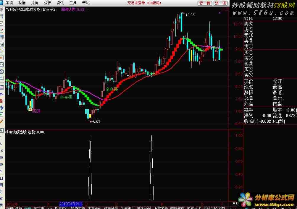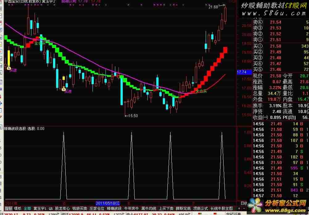 MAC3:=(ATAN((MA(C,3)/REF(MA(C,3),1)-1)*100)*180/3.14115926); M3:=MA(MAC3,3); AA:=PLOYLINE(CROSS(MAC3,M3),M3); AAB:=PLOYLINE(CROSS(M3,MAC3),MAC3); 选股:COUNT(CROSS(MAC3,M3),AA<REF(AA,3) AND AAB>REF(AAB,3)); 精确波段选股 {点击看本软件截图: 58股票 公式网 http://www. 58gu. com 整理} |