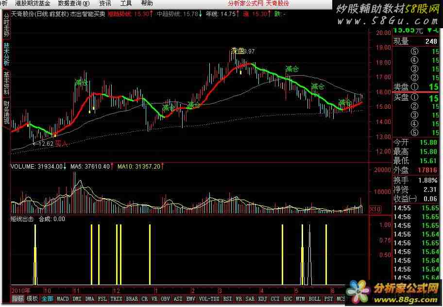 RSV:=(((CLOSE - LLV(LOW,9)) / (HHV(HIGH,9) - LLV(LOW,9))) * 100); K:=SMA(RSV,3,1); D:=SMA(K,3,1); J:=3*K-2*D; X:=LLV(J,2)=LLV(J,8); RE:=CROSS(J,REF(J+0.01,1)) AND X AND J<19; STICKLINE(RE,0,1,3,0),COLORYELLOW; CSS:=((CLOSE-LLV(LOW,8))/(HHV(HIGH,8)-LLV(LOW,8))*100); HH:=CROSS(20,EMA(CSS,3)); CE:=REF(HH,1); AA:=REF(CLOSE,1); BBB:=SMA(MAX(CLOSE-AA,0),5,1)/SMA(ABS(CLOSE-AA),5,1)*1000; HHH:=BBB-LLV(BBB,10); SS:=(MA(HHH,2)*3+HHH*13)/16; 短线买点:=IF(SS>13,MA(SS,2),SS)/6; 短线出击:=IF(CROSS(短线买点,1) AND (短线买点<30),30,1); II:=短线出击=30; 合成:CE AND II; {点击看本软件截图: 58股票 公式网 http://www. 58gu. com 整理} |