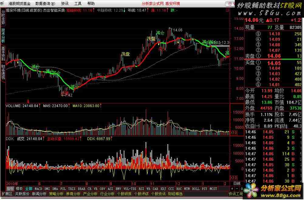 杰出智能系统,将葛南维法则完全程序化,盘中及时提示主力介入杰出智能系统,将葛南维法则完全程序化,盘中及时提示主力介入、顶部卖出、回调买入、抄底、反弹卖出,熊市降低套牢风险,牛市最大化波段收益!葛南维八大法则 在移动平均线中,美国投资专家葛南维(JOGEPSB GANVLE)创造的八项法则可谓其中的精华,历来的平均线使用者无不视其为技术分析中的至宝,而移动平均线也因为它,淋漓尽致地发挥了道·琼斯理论的精神所在。 八大法则中的四条是用来研判买进时机,四条是研判卖出时机。总的来说,移动平均线在股价之下,而且又呈上升趋势时是买进时机,反之,平均线在股价线之上,又呈下降趋势时则是卖出时机。 首先看买进时机。 买1,平均线经过一路下滑后,逐渐转为平滑,并有抬头向上的迹象。别外,股价线也转而上升,并自下方突破了移动平均线,这是第一个买进讯号。 买2,股介线开始仍在移动平均线之上,但呈急剧下跌趋势,在跌破移动平均线后,忽而转头向上,并自下方突破了移动平均线,这是第二个买进讯号。 买3,与买2类似,但股价线尚未跌破移动平均线,只要移动平均线依然呈上升趋势,前者也转跌为升,这是第三个买进讯号。 买4,股价线与移动平均线都在下降,问题在于股价线狠狠下挫,远离了移动平均线,表明反弹指日可待,这第4个买进讯号甚为许多短线客喜爱(所谓抢谷底),但切忌不可恋战,因为大势依然不妙,久战势必套牢。 葛南维的四条卖出法则,与买进的四条法则是一一对应的。 卖1,移动平均线从上升转为平缓,并有转下趋势,而股价线也从其上方下落,跌破了移动平均线,这是第一个卖出讯号。 卖2,股价线和移动平均线均很令人失望地下滑,这时股价线自下方上升,并突破了仍在下落的移动平均线后,又掉头下落,这是第二个卖出讯号。 卖3类似卖2,问题是稍现反弹的股价线更加软弱,刚想突破移动平均线却无力突破,这是第三个卖出讯号。要注意的是卖3与买1不同,买1是移动平均线自跌转平,并有升迹象,而卖3,平均线尚处下滑之中。 卖4,则股价一路暴涨,远远超过了虽也在上升的移动平均线,暴涨之后必有暴跌,所以此处是第四个卖出讯号,以防止暴跌带来的不必要的损失。 经过长期应用后,我们发现,平均线转跌为平,并有向上趋势,股价从平均线下方突破平均线,并始终大致保持在移动平均线之上方,这一段是牛市;而反之,平均线转升为平,并随后下跌,股价线从平均线上方突破平均线之下方,这一段便是熊市了。 至于买4和卖4,怎样才算远离移动平均线,何时为适度,这就是乖离率的研究对象了。 智能买卖系统用法: 下午2:30分后建议打开预警系统!1.指数短趋势上升阶段可全仓操作,指数短趋势下降阶段半仓操作! 2.个股短趋势上升阶段可全仓操作(指数也是上升阶段,否则半仓为宜);个股短趋势下降阶段半仓操作; 3.杰出智能系统中买指令含义:抄底-阶段性底部,可适当买入(风险较小);反弹-下跌途中的反弹,适宜短线博反弹(风险较大);买入-上升途中的洗盘回调,可全仓买入(风险很小); 4.杰出智能系统中卖指令含义:减仓-上升遇到一定阻力,宜减少仓位,若成交量减小,则有可能是上升途中的洗盘;卖出-上升遇到强阻力,宜清仓;危险-指高位盘旋后即将下跌信号,宜清仓,放量-一般建议清仓观望; 5.主力介入:指主力介入的信号,量能急剧放大,可考虑立即追涨,也可考虑回调后买入,须防止主力拉高出货(注:主力包括机构、大户、私募等);能买卖系统用法:杰出智能买卖系统 {请一定要学习葛南维法则的精髓,才能够合理使用该指标,通达信适用 分析家公式网整理WWW.88GS.COM} 短趋势线:MA(CLOSE,13),COLORRED,LINETHICK3; 中线:=MA(CLOSE,33),LINETHICK1; 中趋势线:MA(CLOSE,55),LINETHICK1,COLORGRAY; 年线:MA(CLOSE,250),LINETHICK1,COLORLIGRAY,POINTDOT; 涨:IF(短趋势线>REF(短趋势线,1),短趋势线,DRAWNULL),COLORRED,LINETHICK3; 平:=IF(短趋势线=REF(短趋势线,1),短趋势线,DRAWNULL),COLOR00FFFF,LINETHICK3; 跌:IF(短趋势线<REF(短趋势线,1),短趋势线,DRAWNULL),COLORGREEN,LINETHICK3; 上极限:=((C-REF(MA(CLOSE,20),1))/20+短趋势线)*1.20; DRAWTEXT(CROSS(CLOSE,上极限),H*1.02,'减仓'),COLORGREEN; DRAWTEXT(CROSS(CLOSE,MA(C,13)) AND 短趋势线<REF(短趋势线 ,1) AND 短趋势线<中趋势线 ,H*1.02,'减仓'),COLORGREEN; DRAWTEXT(CROSS(短趋势线,C) AND INDEXC>MA(INDEXC,13) AND 短趋势线>REF(短趋势线 ,1) AND V<REF(V,1) AND 短趋势线>中趋势线 ,L*0.97,'买入'),COLORRED; STICKLINE(CROSS(短趋势线,C) AND 短趋势线>REF(短趋势线 ,1) AND V<REF(V,1) AND 短趋势线>中趋势线 ,L,L*0.99,2,0),COLORYELLOW; VAR1:=((CLOSE-MA(CLOSE,6))/MA(CLOSE,6)*100+(CLOSE-MA(CLOSE,24))/MA(CLOSE,24)*100+(CLOSE-MA(CLOSE,32))/MA(CLOSE,32)*100)/3; DRAWTEXT(VAR1>9 AND V<REF(V,1) AND FILTER(VAR1<REF(VAR1,1),5),H*1.02,'洗盘'),COLORYELLOW; DRAWTEXT(VAR1>9 AND V>REF(V,1) AND FILTER(VAR1<REF(VAR1,1),5),H*1.02,'减仓'),COLORGREEN; DRAWTEXT(VAR1>20 AND FILTER(VAR1<REF(VAR1,1),5),H*1.06,'卖出'),COLORYELLOW; VAR2:=HHV(VAR1>20,10); DRAWTEXT(FILTER(VAR1<-9 AND VAR1>REF(VAR1,1),18) AND V>REF(V,1),L*0.98,'反弹'),COLORRED; DRAWTEXT(VAR1<-20 AND FILTER(VAR1> REF(VAR1,1),5),L*0.95,'抄底'),COLORYELLOW; DRAWTEXT(VAR2 AND CROSS((REF(HIGH,1)+REF(LOW,1))/2,MA(CLOSE,20)+2*STD(CLOSE,20)),H*1.1,'危险'),COLORYELLOW; {WWW.88GS.COM} VAR12:=(HIGH - LOW); VAR3:=ABS((OPEN - CLOSE)); VAR4:=(HIGH - IF((CLOSE > OPEN),CLOSE,OPEN)); VAR5:=(IF((CLOSE > OPEN),OPEN,CLOSE) - LOW); VAR6:=((VAR3 / VAR12) * VOL); VAR7:=((VAR4 / VAR12) * VOL); VAR8:=((VAR5 / VAR12) * VOL); VARB:=(((MA(CLOSE,5) > MA(CLOSE,10)
