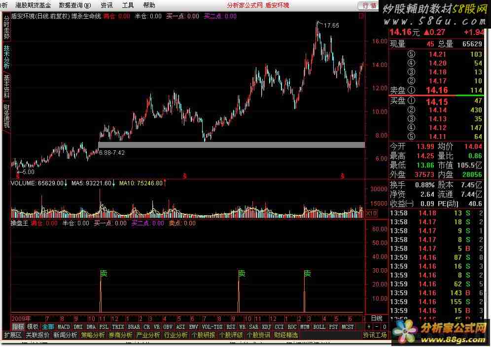 操盘王,成功率96.9%【通达信版】X:=C-REF(MA(C,20),11);LGL:=IF(EMA(C,5)/EMA(EMA(C,9),16)<=0.85 AND C/REF (C,1)>0.905 AND C/REF(C,1)<1.05 AND VOL/CAPITAL*100<5,50,0); WR1:=-100*(HHV(HIGH,34)-CLOSE)/(HHV(HIGH,34)-LLV(LOW,34))+100*X; WR2:=-100*(HHV(HIGH,50)-CLOSE)/(HHV(HIGH,50)-LLV(LOW,50))+100; WR3:=-100*(HHV(HIGH,70)-CLOSE)/(HHV(HIGH,70)-LLV(LOW,70))+100*X; BIAS1:=((CLOSE-MA(CLOSE,34))/MA(CLOSE,34)*100+10)*5; BIAS2:=((CLOSE-MA(CLOSE,50))/MA(CLOSE,50)*100+10)*5; BIAS3:=((CLOSE-MA(CLOSE,70))/MA(CLOSE,70)*100+10)*5; S1:=(WR1+WR2+WR3+BIAS1+BIAS2+BIAS3)/6*X;S2:=EMA(S1,3); S3:=ABS(BIAS1-BIAS3);SX:=(S1+S3)/2;XC1:=(-1)*(EMA(100*(1-WINNER(CLOSE)),1)-50)+50; CCC:=XC1+SX; ZJZ:=IF( LGL>0 AND CCC<0,200,0)*X; LXL:=IF(SX<0 AND C=LLV(C,5) AND C/REF(C,1)>0.905 AND C/REF(C,1)<1.05 AND VOL/CAPITAL*100<5,-50,0); JBJ:=IF(CCC<0 AND LXL=-50,100,0)*X;MA3:= MA(C,3);C0:=REF(C,2)*0.865; C1:=REF(C,13)*0.772;BOT:=MIN(C0,C1);HSL:=100*VOL/CAPITAL*X;MA13:=MA(C,13)*X; CXC:=IF((C-BOT)/C<3/100 AND SUM(HSL,5)/5<1.8,1,0); VMC:=IF(CXC>0 AND (LXL<0 OR LGL>0),10,0); 满仓:IF((VMC>0),60,0),COLORRED,STICK,LINETHICK2; DRAWTEXT(满仓=60,60, '满仓'),COLORRED; 半仓:IF(((ZJZ>0 AND JBJ>0 AND SUM(VOL/CAPITAL*100,5)/5<1) OR (CXC>0 AND REF(C,1)/REF(C,2)>0.902)) OR (((ZJZ>0 AND JBJ>0 AND SUM(VOL/CAPITAL*100,5)/5<1) OR CXC>0) AND (LXL<0 OR LGL>0)) AND VMC<10 ,45,0),COLORC0C0C0,STICK; DRAWTEXT(半仓=45,45, '半仓'),COLORC0C0C0; V93:=(((ZJZ>0 AND JBJ>0 AND SUM(VOL/CAPITAL*100,5)/5<1) OR CXC>0) AND (LXL<0 OR LGL>0)) ; V90:=((ZJZ>0 AND JBJ>0 AND SUM(VOL/CAPITAL*100,5)/5<1) OR (CXC>0 AND REF(C,1)/REF(C,2)>0.902)); 买一点:IF((V93 OR V90),30,0),COLORC080FF;DRAWTEXT(买一点=30,30, '买1'),COLORC080FF; VAR2Q:=(MA(CLOSE,80)-MA(CLOSE,13)/3);神奇线:= MA((CLOSE-VAR2Q)/VAR2Q,1); 买二点:IF(CROSS(神奇线,0) AND LOW/REF(HIGH,1)<1.012 AND ((C-REF(C,2))/C)>0.06,30,0),COLORFF00FF; DRAWTEXT(买二点=30,30, '买2'),COLORFF00FF; YY:=SMA(SMA((CLOSE-LLV(LOW,55))/(HHV(HIGH,55)-LLV(LOW,55))*100,18,1),12,1); YT:=SMA((CLOSE-LLV(LOW,55))/(HHV(HIGH,55)-LLV(LOW,55))*100,12,1); ST:=IF(CROSS(YT,YY),30,0);VAR5PT:=(HIGH+LOW+CLOSE)/3; VAR6PT:=(VAR5PT-MA(VAR5PT,14))/(0.015*AVEDEV(VAR5PT,14)); VAR7PT:=(VAR5PT-MA(VAR5PT,85))/(0.015*AVEDEV(VAR5PT,85)); SA:=IF(VAR7PT>=200 AND VAR6PT>=150,10,0);VAR3QQ:=REF(CLOSE,1); VAR4QQ:=SMA(MAX(CLOSE-VAR3QQ,0),6,1)/SMA(ABS(CLOSE-VAR3QQ),6,1)*100; SM:=IF(CROSS(80,VAR4QQ),30,0);卖点:IF((SM AND (SA OR ST)),30,0),COLOR0080FF; DRAWTEXT(卖点=30,30, '卖'),COLOR00FF00; {点击看本软件截图: 58股票 公式网 http://www. 58gu. com 整理} |