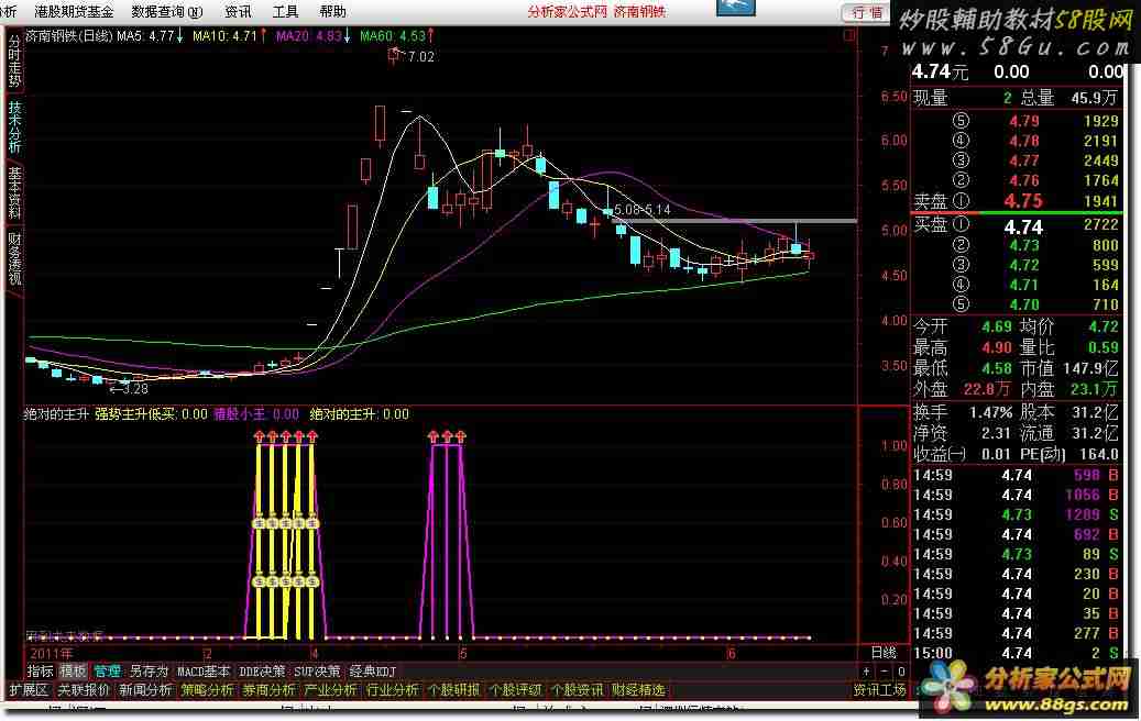 {绝对的主升} 清仓:=1.66*MA(FORCAST(CLOSE,2),40),COLORRED; 出货:=1.36*MA(FORCAST(CLOSE,2),40),COLOR08FFFF; 高抛:=1.16*MA(FORCAST(CLOSE,2),40),COLORFF82FF; 低吸:=0.82*MA(FORCAST(CLOSE,2),40),COLORF7E300; 满仓:=0.72*MA(FORCAST(CLOSE,2),40),COLORGREEN; 强通1:=清仓>REF(清仓,1),; 强通2:=出货>REF(出货,1),; 强通3:=高抛>REF(高抛,1),; 强通4:=低吸>REF(低吸,1),; 强通5:=满仓>REF(满仓,1),; 上升通道:=强通1 AND 强通2 AND 强通3 AND 强通4 AND 强通5; MA5:=MA(CLOSE,5); MA10:=MA(CLOSE,10),; MA20:=MA(CLOSE,20); MA30:=MA(CLOSE,30); MA60:=MA(CLOSE,60); 五强:=MA5>REF(MA5,1),; 十强:=MA10>REF(MA10,1),; 二十强:=MA20>REF(MA20,1),; 三十强:=MA30>REF(MA30,1),; 六十强:=MA60>REF(MA60,1),; 小均强:=五强 AND 十强,; 均强:=十强 AND 二十强 AND 三十强,; 大均强:=十强 AND 二十强 AND 三十强 AND 六十强; JJD:=(H+L+C)/3; 强势线1:=HHV(MA((((LOW + HIGH) + CLOSE) / 3),8),60),COLORRED,LINETHICK2; 强势线2:=HHV(MA((((LOW + HIGH) + CLOSE) / 3.18),8),20),COLORWHITE,LINETHICK2; 强势线3:=HHV(MA((((LOW + HIGH) + CLOSE) / 3.258),8),10),COLORYELLOW,LINETHICK2; 强势线4:=HHV(MA((((LOW + HIGH) + CLOSE) / 3.08),80),13),COLORLIMAGENTA,LINETHICK2; 开始走强1:=强势线1>REF(强势线1,1),; 开始走强2:=强势线2>REF(强势线2,1),; 开始走强3:=强势线3>REF(强势线3,1),; 开始走强4:=强势线4>REF(强势线3,1),; 双强1:=开始走强1 AND 开始走强2,; 双强2:=开始走强2 AND 开始走强3,; 双强3:=开始走强2 AND 开始走强3,; 双强4:=开始走强3 AND 开始走强4,; 三强:=开始走强1 AND 开始走强2 AND 开始走强3,; 四强:=开始走强1 AND 开始走强2 AND 开始走强3 AND 开始走强4,; 强势为王:=双强1 OR 双强2 OR 双强3 OR 双强4 OR 三强 OR 四强; VV:=(C+L+H)/3; DSA:=SMA(XMA(VV,15),2,1)LINETHICK3; 顶部1:=DSA*1.0888,COLORMAGENTA,LINETHICK1; 顶部2:=DSA*1.158,COLORBROWN,LINETHICK1; 顶部3:=DSA*1.218,COLORRED,LINETHICK1; 底部1:=DSA*0.9518,COLORLICYAN,LINETHICK1; 底部2:=DSA*0.888,COLORLIMAGENTA,LINETHICK1; 底部3:=DSA*0.8,COLORGREEN,LINETHICK1; MA1:=MA(CLOSE,5); MA2:=MA(CLOSE,10); MA3:=MA(CLOSE,20); MA4:=MA(CLOSE,60); 五日走强:=MA1>REF(MA1,1),; 十日走强:=MA2>REF(MA2,1),; 二十日走强:=MA3>REF(MA3,1),; 六十日走强:=MA4>REF(MA4,1),; 低位主升:=五日走强 AND 十日走强 AND 六十日走强,; 主升浪:=五日走强 AND 十日走强 AND 二十日走强,; 大主升浪:=十日走强 AND 二十日走强 AND 六十日走强,; 大主升浪2:=五日走强 AND 十日走强 AND 二十日走强 AND 六十日走强,; 总主升:=主升浪 AND 大主升浪 AND 大主升浪2,; 总主升浪:=低位主升 OR 主升浪 OR 大主升浪 OR 大主升浪2 OR 总主升,; 强势主升低买:L<底部1 AND 总主升浪 AND 强势为王 AND C<DSA,COLORYELLOW,LINETHICK2; 猎股小王:L<底部1 AND C<DSA AND 强势为王,COLORMAGENTA,LINETHICK2,LINESTICK; DRAWICON(猎股小王>0,1.1,1); 猎股大王出击:=强势主升低买 AND 猎股小王 AND H<DSA,COLORRED; A:=MA(C,30); A1:=A*1.1; A4:=A*0.9; A2:=A1-(A1-A4)*0.191; 持仓:=IF(HIGH*1.01>A2 OR REF(HIGH,1)>REF(A2,1),A1,A4),LINETHICK3,COLORRED; 生命线:=IF(HIGH*1.01>A2 OR REF(HIGH,1)>REF(A2,1),A2,A4),LINETHICK3,COLORFFFFFF; 主升持仓:=持仓>生命线,; 主升1:=持仓>REF(持仓,1),; 主升2:=生命线>REF(生命线,1),; 主升:=主升1 AND 主升2,; 主升猎股王:=(猎股大王出击 AND 主升持仓 AND 主升) OR (猎股小王 AND 主升持仓 AND 主升),; 绝对的主升:(主升猎股王 AND 小均强) OR (猎股小王 AND 小均强),COLORYELLOW,LINETHICK4,STICK; DRAWICON(绝对的主升>0,1.1,1); DRAWICON(绝对的主升>0,1.1,1); DRAWICON(绝对的主升>0,0.6,9); DRAWICON(绝对的主升>0,0.3,9); {点击看本软件截图: 58股票 公式网 http://www. 58gu. com 整理} |