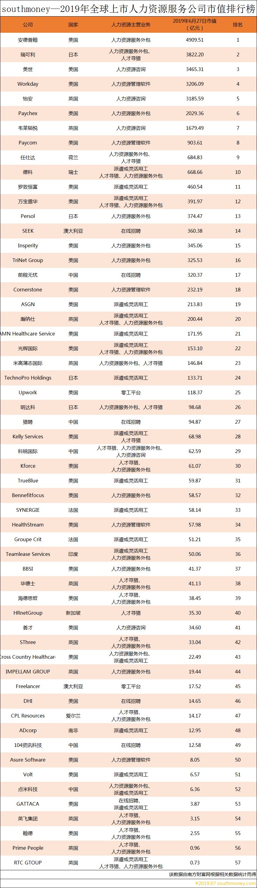 以上就是本次南方财富网为读者们带来的2019全球上市人力资源服务公司市值榜的相关信息,本文是根据数据及近期事件所撰写分析文章,并不构成投资建议,请投资者根据具体情况权衡利弊,据此操作,风险自担!(本文属于非商业性文章)