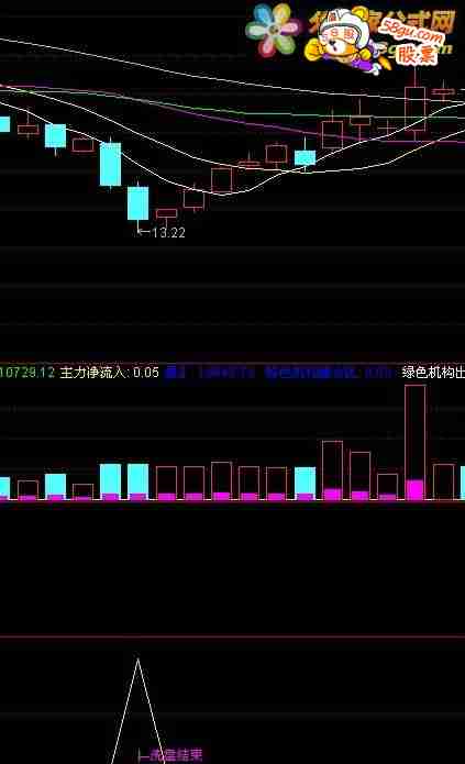 | V1:=(C*2+H+L)/4*10;<br/>V2:=EMA(V1,13)-EMA(V1,34);<br/>V3:=EMA(V2,5);<br/>V4:=2*(V2-V3)*5.5;<br/>庄家秘密撤: IF(V4<=0,V4,0),COLOR00FF00,LINETHICK2;<br/>庄家秘密进: IF(V4>=0,V4,0),COLORFF00FF,LINETHICK |