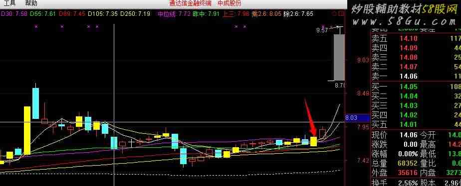 | VRA:=EMA(100*(C-LLV(LOW,34))/(HHV(H,34)-LLV(LOW,34)),3);<br/>底部:STICKLINE(CROSS(VRA,9),0,5,3.5,0),COLORFF00FF;<br/>STICKLINE(CROSS(VRA,9),5,10,2.5,0),COLOR00FFFF;<br/>STICKLINE(CROSS(VRA,9),10,15,1. |