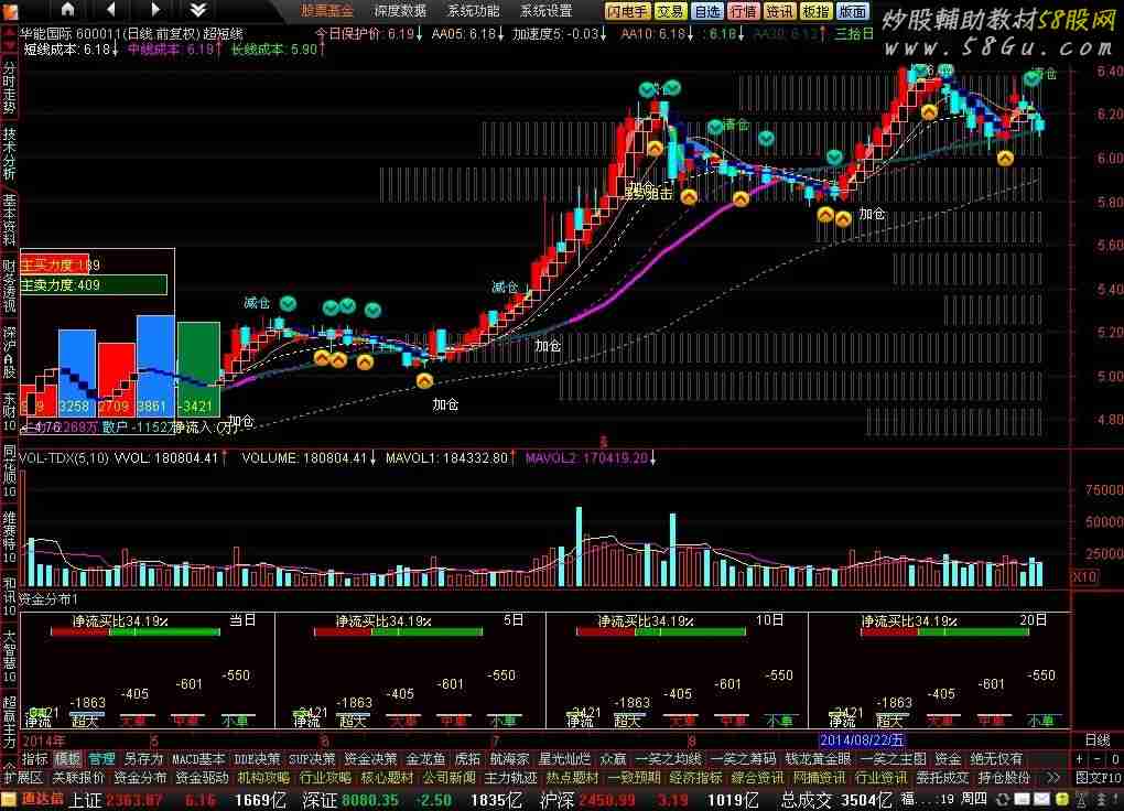 | 大家来看看。说说吧自动画线 高低压力支撑(高点压力、低点支撑、指导线、重心)快线:EMA(EMA(EMA(EMA(CLOSE,2),2),2),2),LINETHICK2,COLOR0000FF;<br/>慢线:EMA(REF(快线,1),2),LINETHICK2,COLOR00FFFF;<br/>快线:EMA(E |