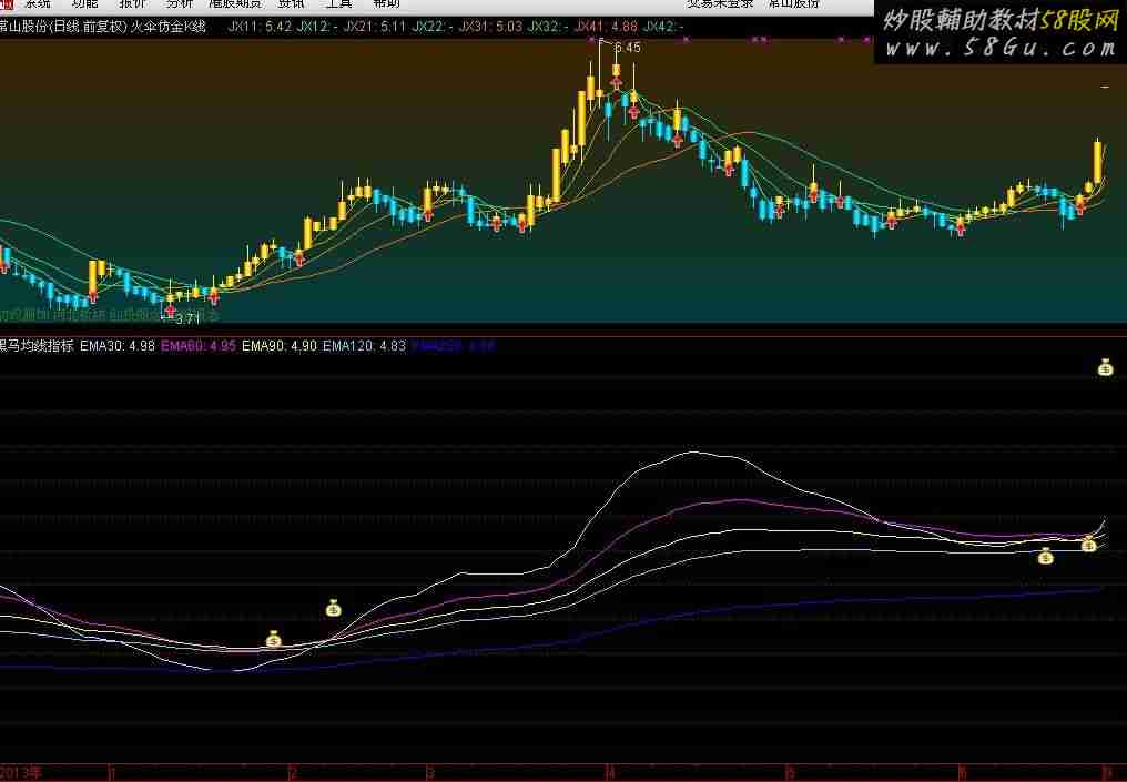 | 均价:=(2*C+(C+H+L+O)/4+O)/4;<br/>R:=(2*L+3*均价)/5;R1:=(2*H+3*均价)/5;<br/>M3:=EMA((R+r1)/2,3);<br/>M5:=EMA((R+r1)/2,5);<br/>M8:=EMA((R+r1)/2,8),COLORWHITE;<br/>M13:=EMA((R+r1)/2,13);<br/>M21:=EMA((R+ |