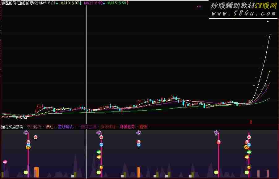 | X1:=(C+L+H)/1.5;<br/>X2:=EMA(X1,3);<br/>X3:=EMA(X2,2.5);<br/>DRAWICON(CROSS(X2,X3),L*0.98,9),COLORRED;<br/>STICKLINE(X2>=X3,LOW,HIGH,0,1),COLORRED;<br/>STICKLINE(X2>=X3,CLOSE,OPEN,3.2,2),COLORRED;<br/ |