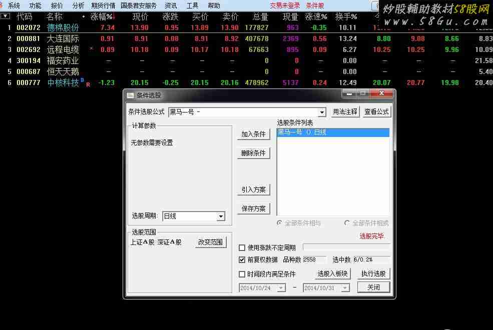 | XG:KDJ.J>20 AND <br/>KDJ.J<80 AND <br/>DMI.PDI>REF(DMI.PDI,1)AND <br/>DMI.PDI<20 AND <br/>CROSS(CCI(14),-100);<br/><img src="http://pic.58gu.com/www/88gs/com/soft/UploadPic/2014-10/201410311738435622 |