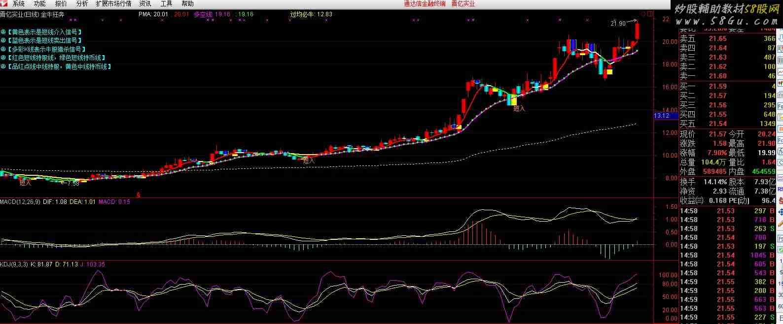 | CS:=(CLOSE-LLV(LOW,8))/(HHV(HIGH,8)-LLV(LOW,8))*100;<br/>YJD: (EMA(CS,3)-50)*2;<br/>柱:YJD,COLORSTICK,COLORRED;<br/>YJF:MA(YJD,5),COLORYELLOW;<br/><img src="http://pic.58gu.com/www/88gs/com/soft/Uplo |