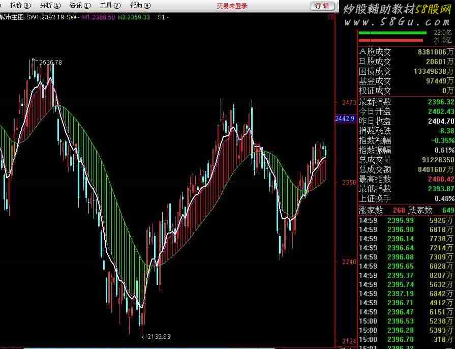 | C1:=REVERSE(C);<br/>DRAWKLINE(-LOW, -OPEN, -HIGH, -CLOSE);MID : MA(C1,26); <br/>UPPER: MID + 2*STD(C1,26); <br/>LOWER: MID - 2*STD(C1,26); <br/>MA15:MA(C1,15);<br/>IF(MA15>REF(MA15,1),MA15,DRAWNULL),L |