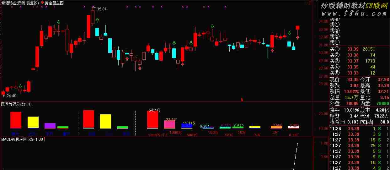 | 设计思想:立足于股价变化,按照随机指标的思路设计。<br/>操作方法:大盘指数的粉色线在上时,属于波段买入阶段;在此阶段中,个股的粉色线在上时,出现买一、二,均可买入。当然,能配合MACD指标用就最好。<br/>V1:=(C*2+H+L)/4*10;< |